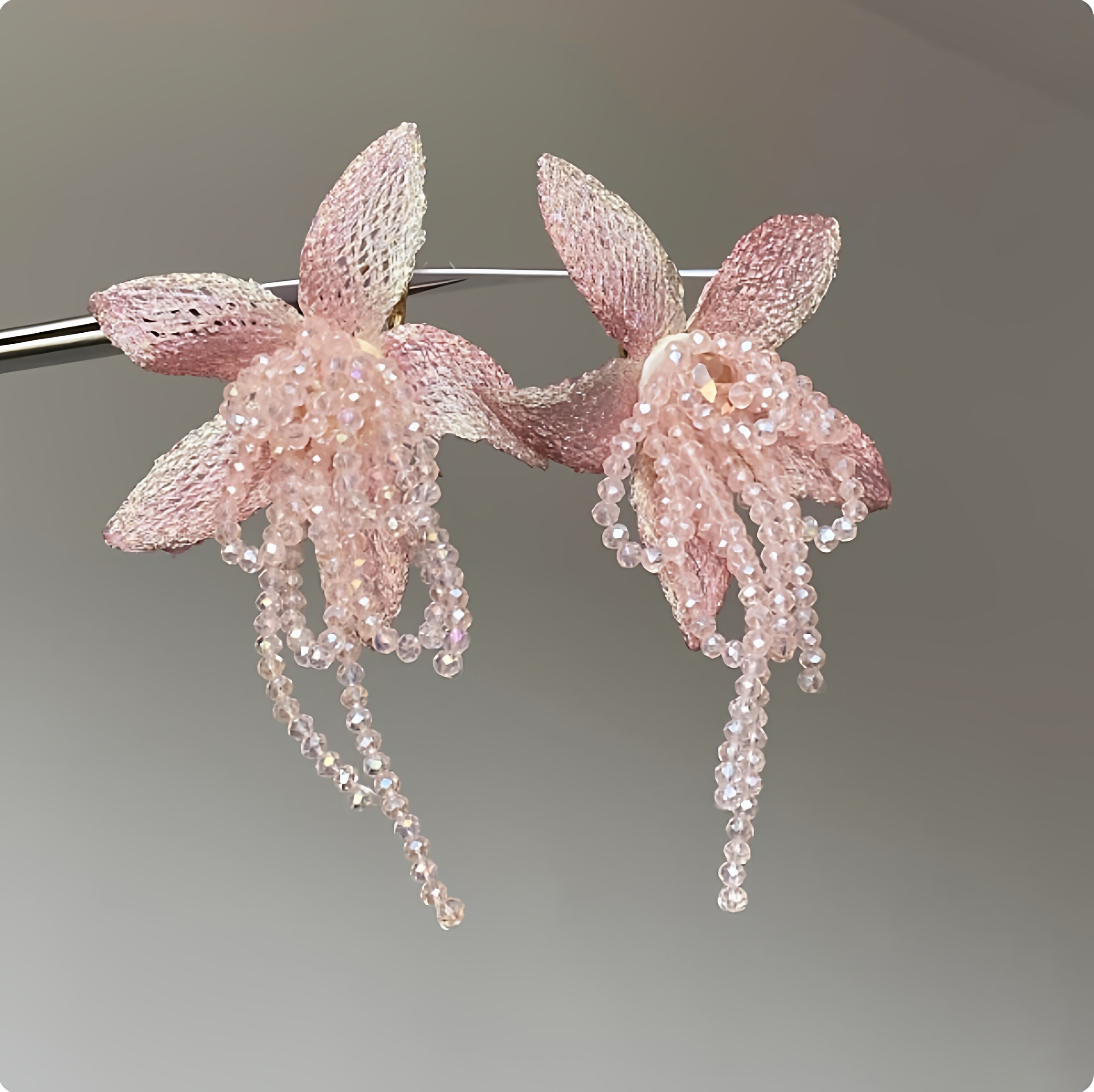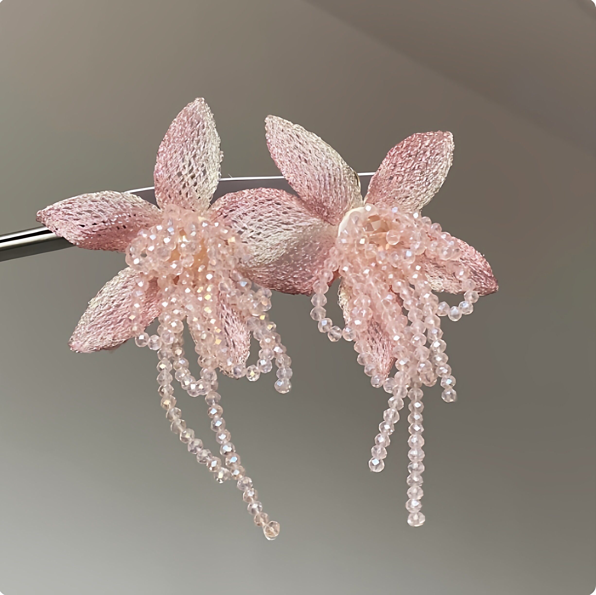 韩国新款超仙粉色水晶花朵耳环项链套装时尚小众甜美少女心锁骨