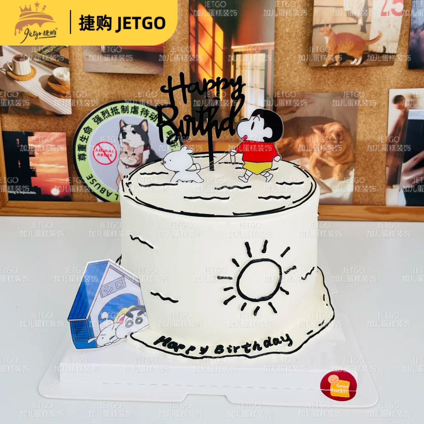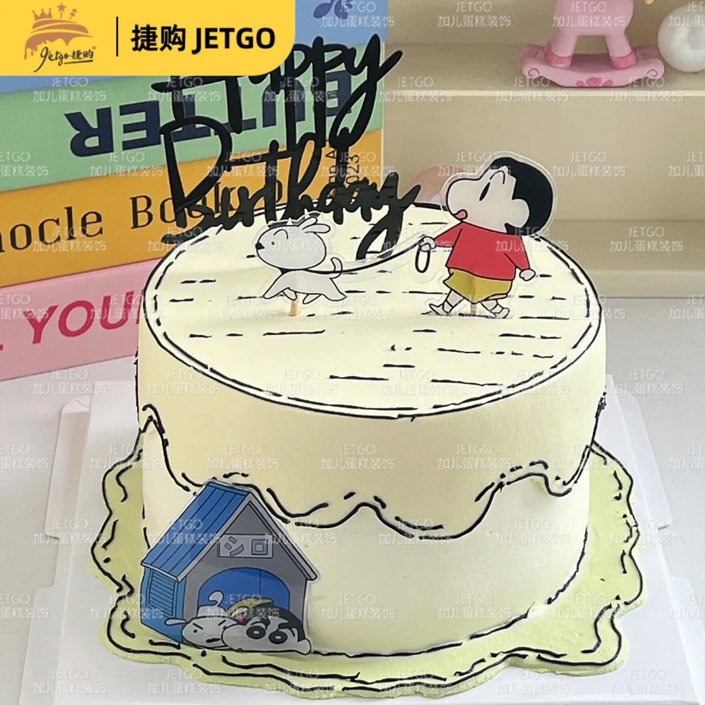 蜡笔小新遛狗蛋糕装饰插件亚克力黑色生日快乐插牌简约风烘焙装扮