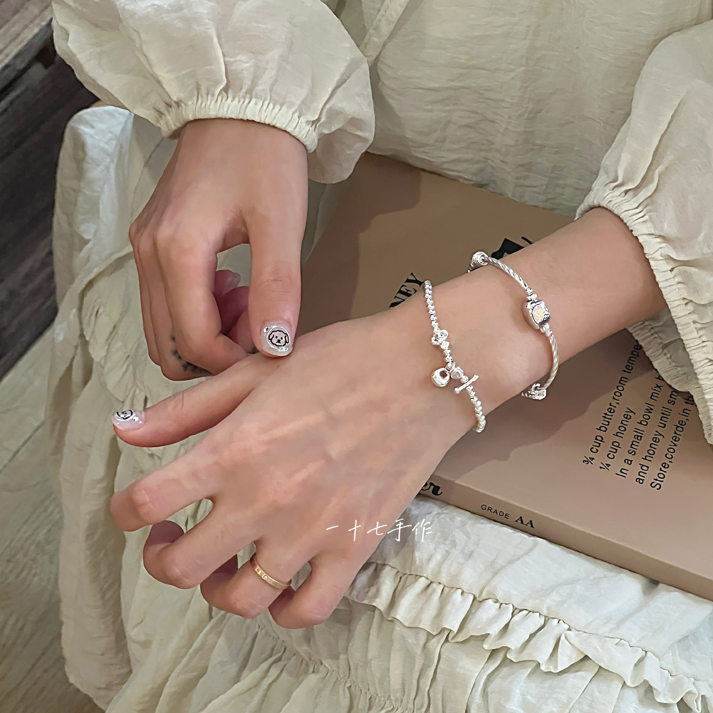 一十七手作 原创设计简约小众凯蒂猫s925银弯管银珠弹力绳手链女