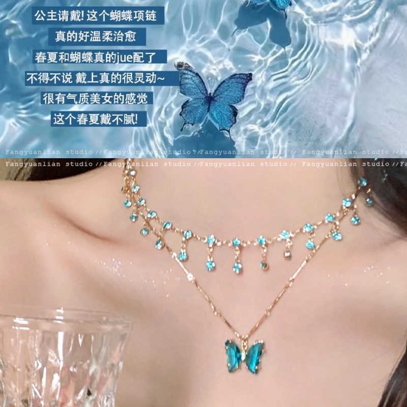 我先夏咯 蓝色蝴蝶双层叠戴项链女夏日清凉高级感锁骨链颈链配饰