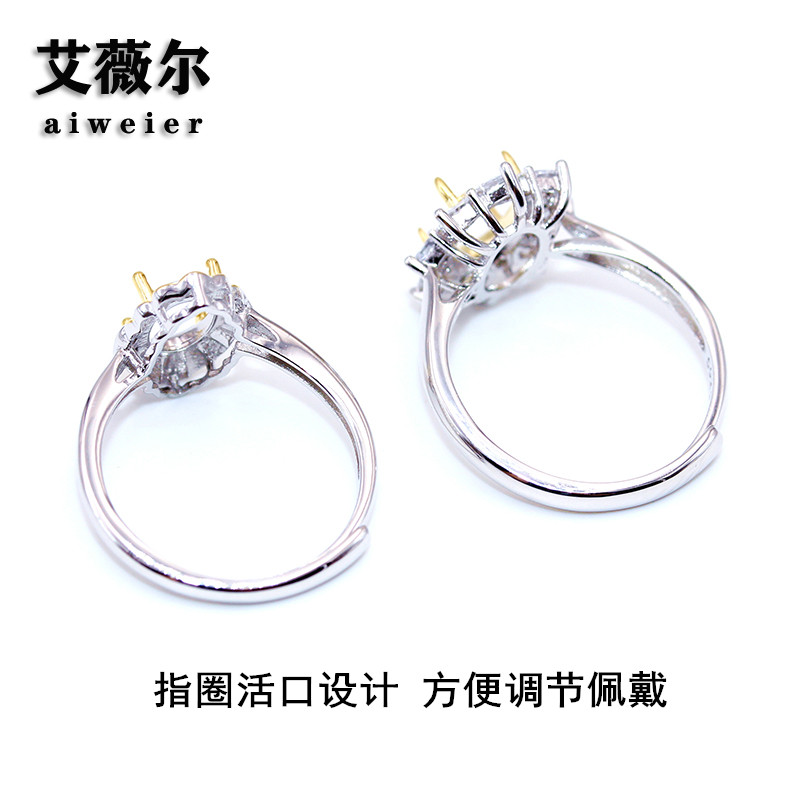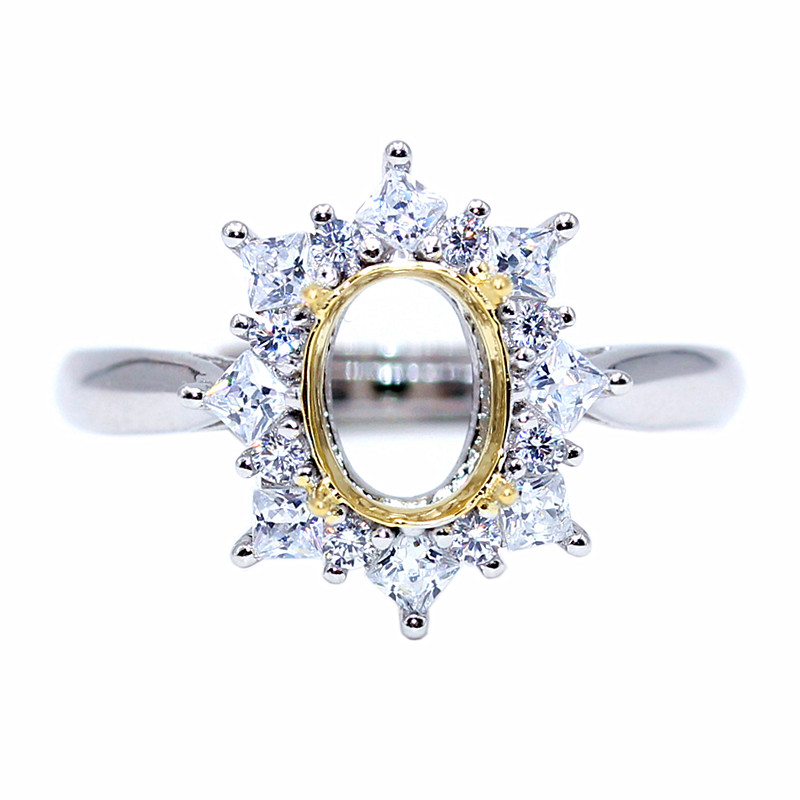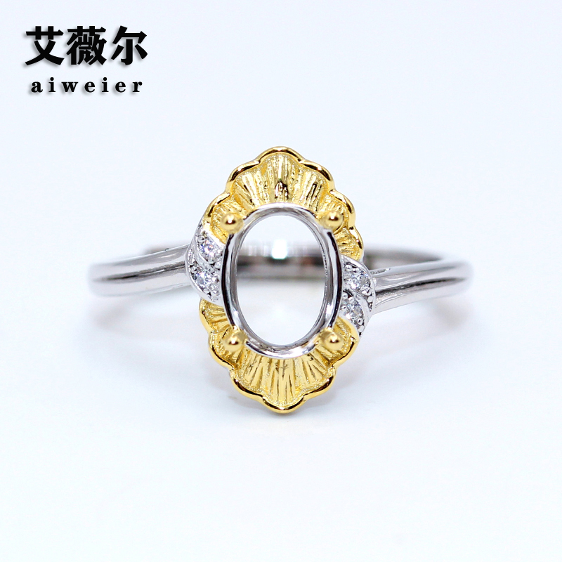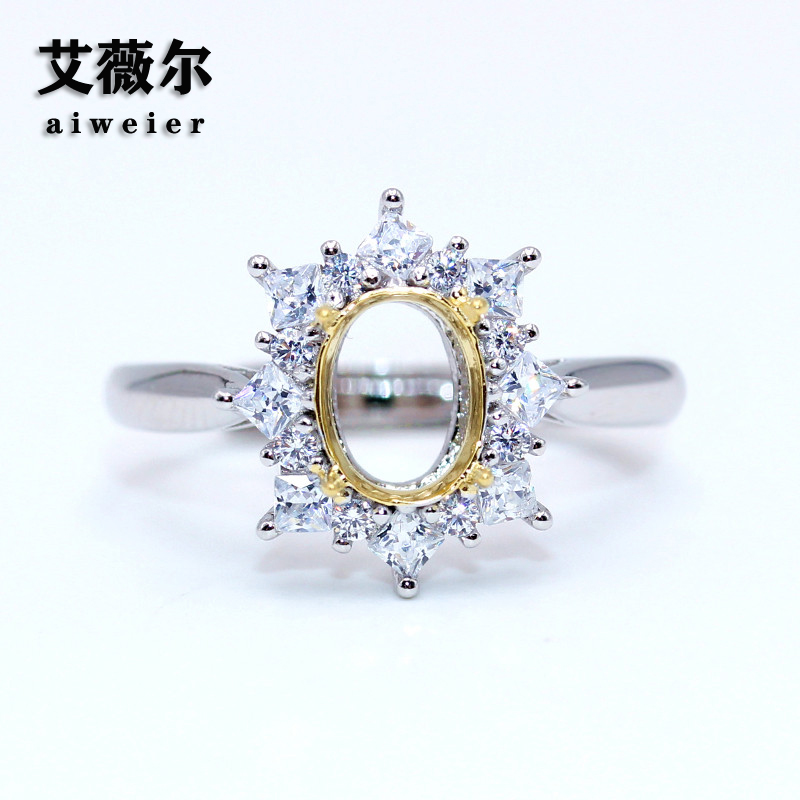 精工925纯银戒指空托代加工镶嵌双色拼色戒托宝石定制18K金6*8mm