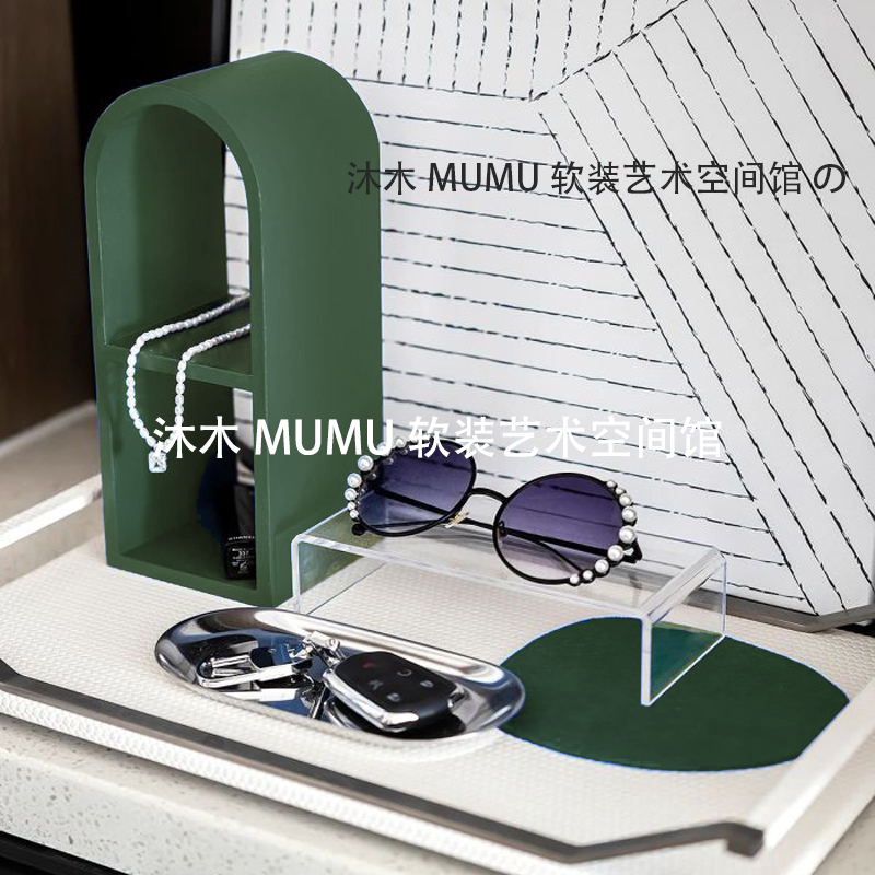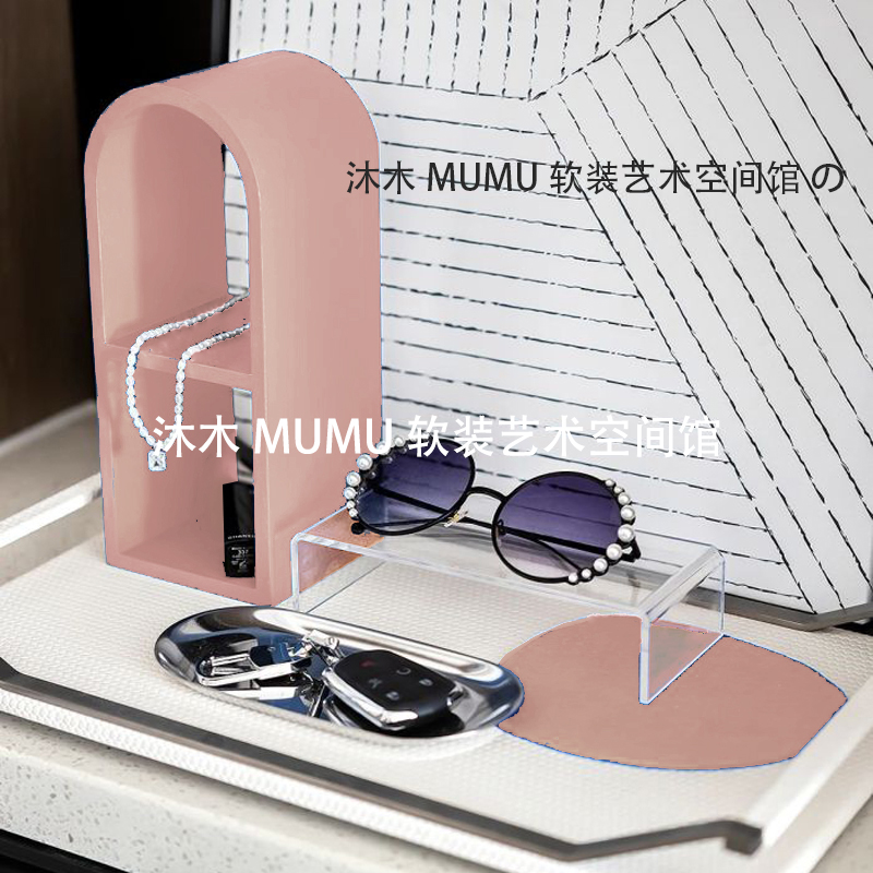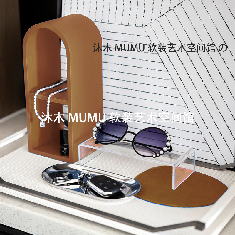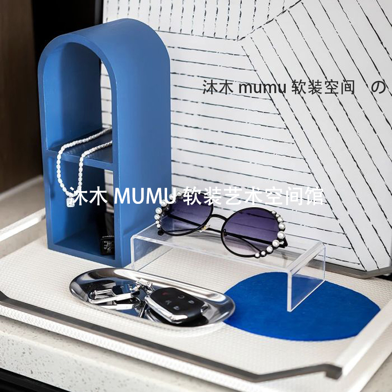 样板房卧室梳妆台软装蓝色主题摆件皮革金属托盘车钥匙女士太阳镜