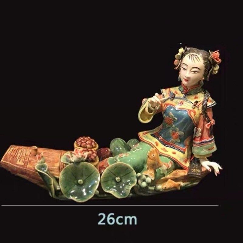 石湾陶瓷公仔顺利船荷叶仕女手工摆件门客厅酒柜博古架餐厅渔船女
