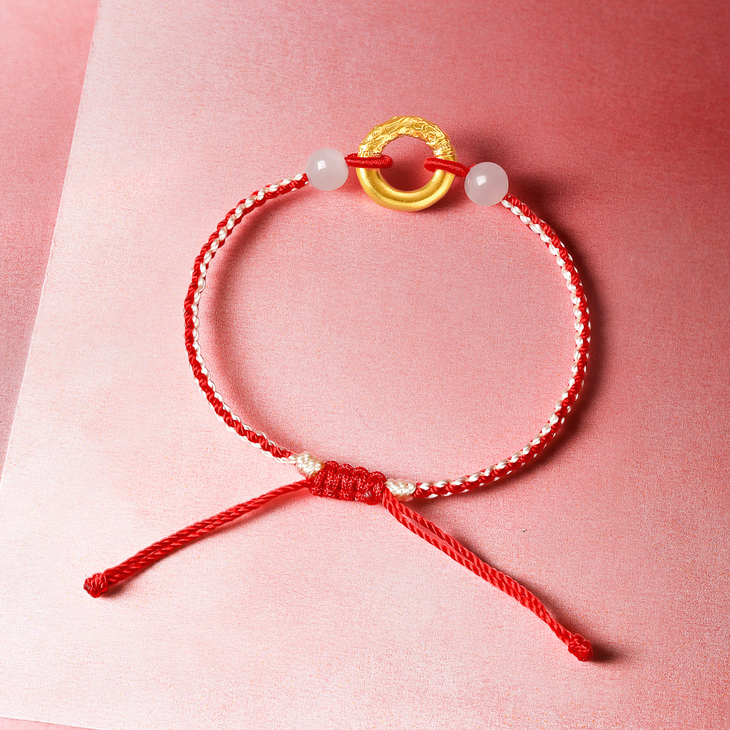 周六福5D硬金和田白玉手绳金镶玉祥云平安扣首饰节日礼物