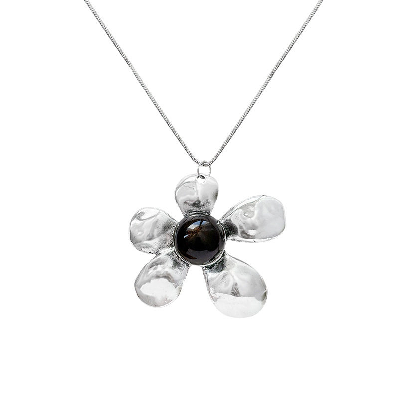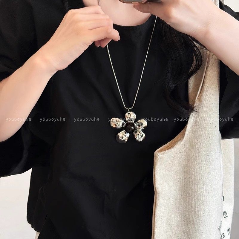 韩系复古银色花朵吊坠项链女夸张高级感长款ins风卫衣链个性配饰