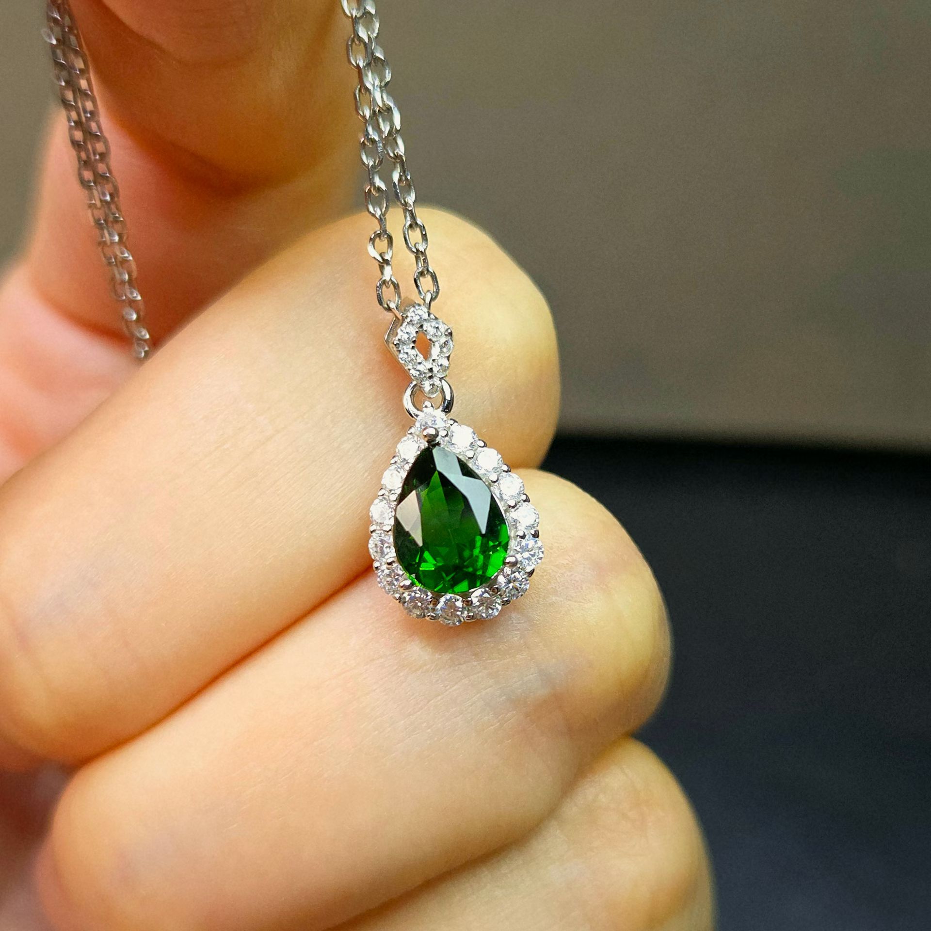 天然透辉石水滴戒指吊坠搭配做套装款6*8mm净体精选铬绿色银镶
