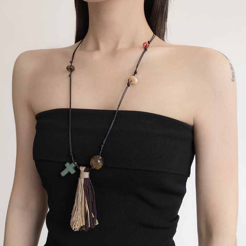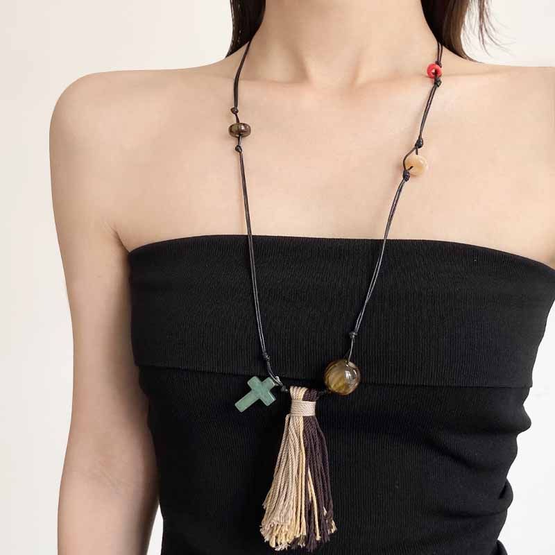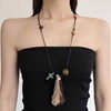 法式长款编织虎眼石扫帚吊坠项链女轻奢高级感可抽拉毛衣链锁骨链