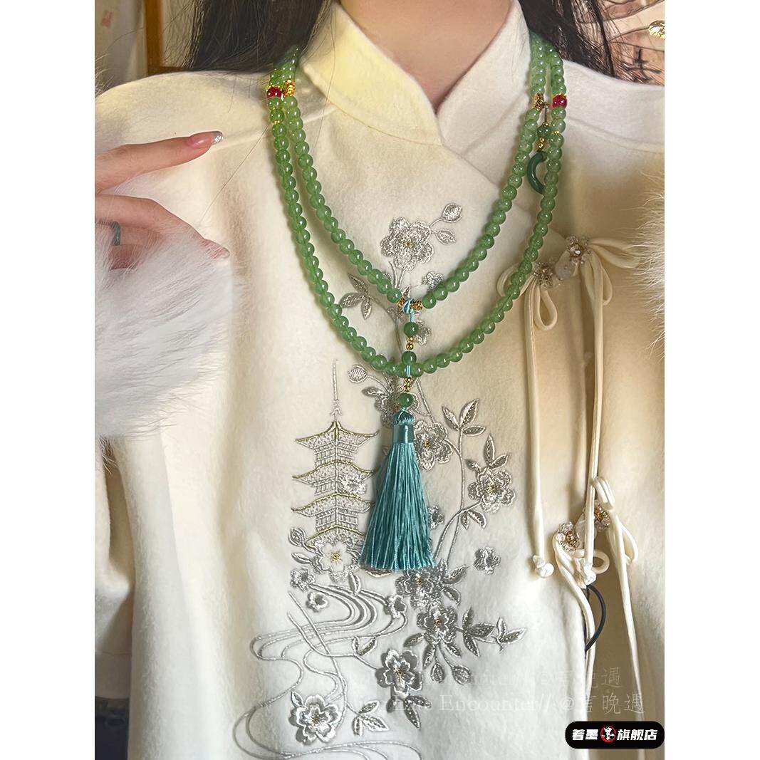 国风新中式108颗红色串珠子流苏项链长款斜挎链古风汉服旗袍配饰