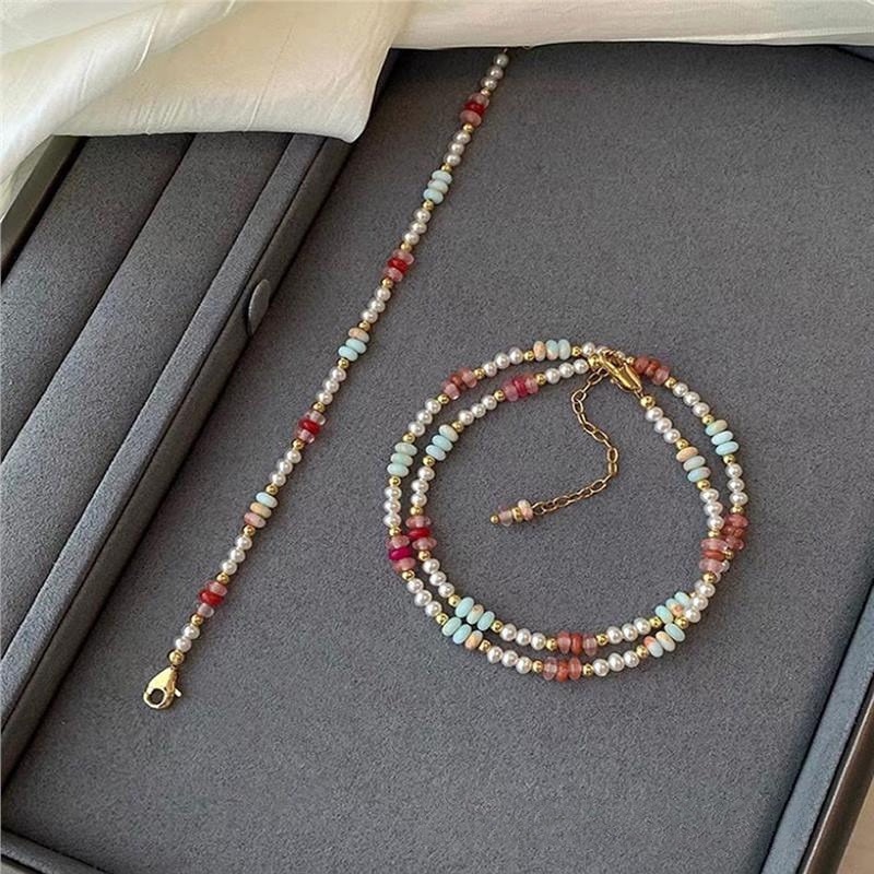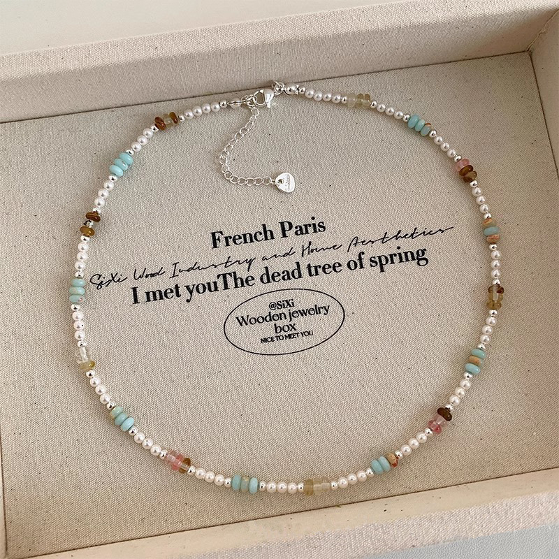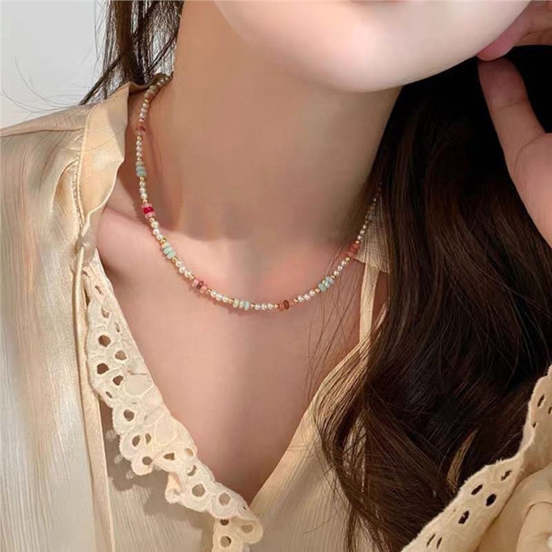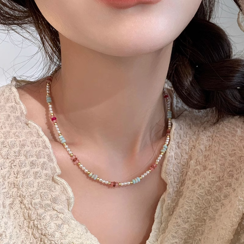 施家珍珠混色天然石蓝色寿山石颈链女多巴胺气质网红小清新项链夏