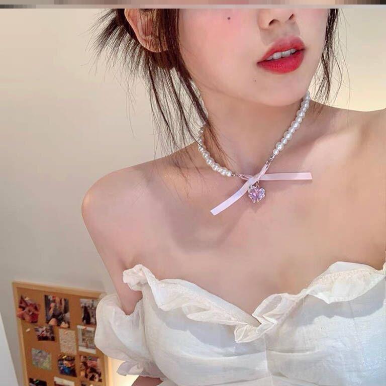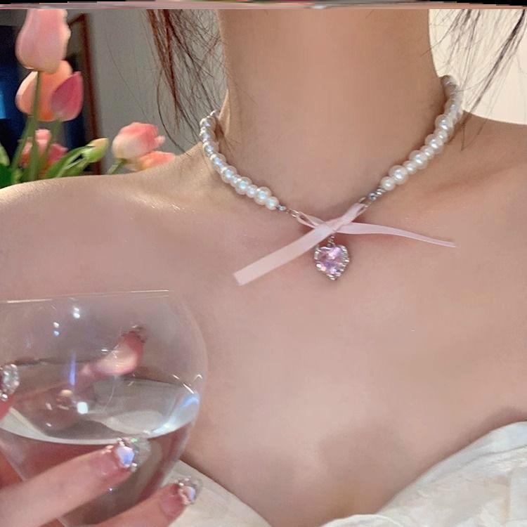 在逃公主粉色蝴蝶结爱心珍珠项链女小众设计感轻奢百搭法式锁骨链