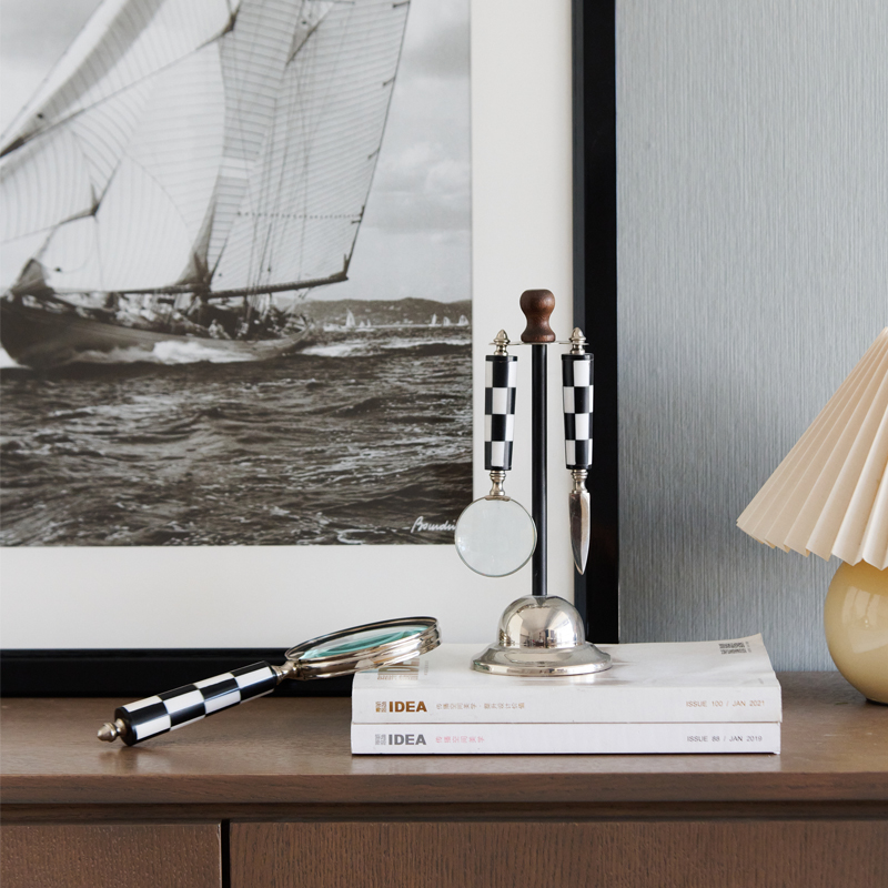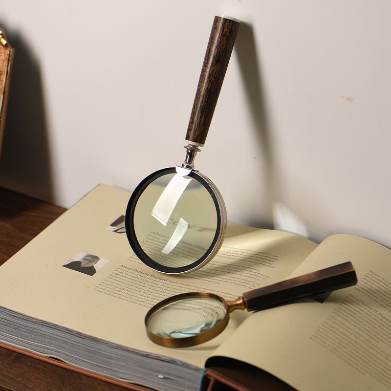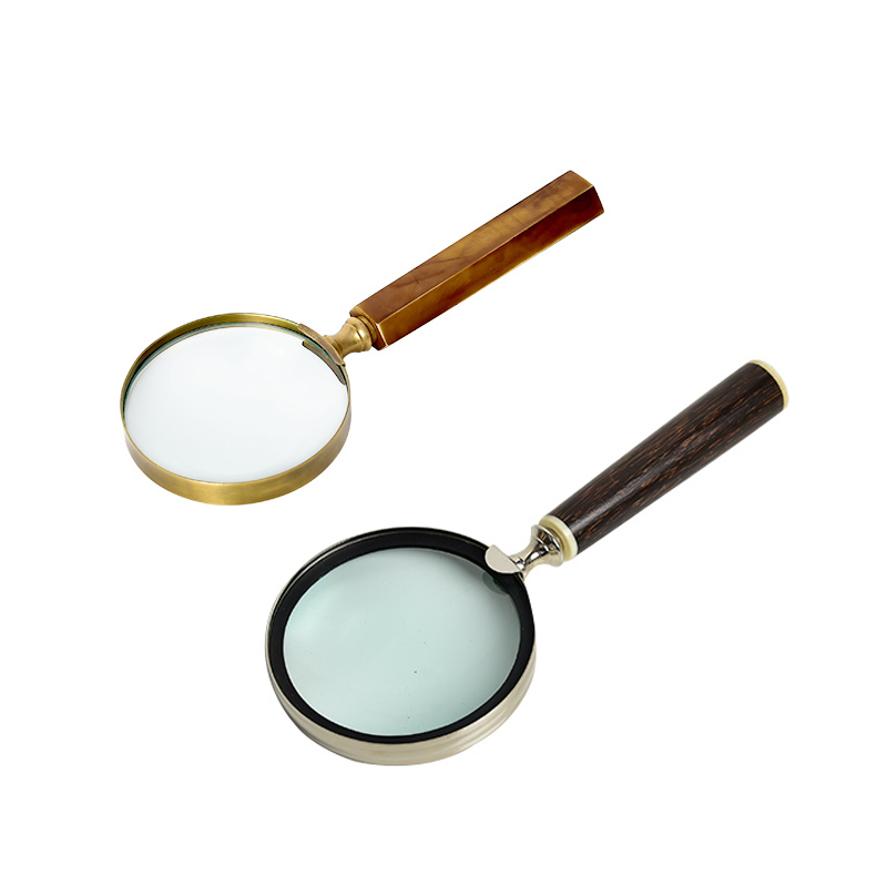 进口复古做旧黄铜实木把柄放大镜摆件样板间客厅卧室书房桌面装饰
