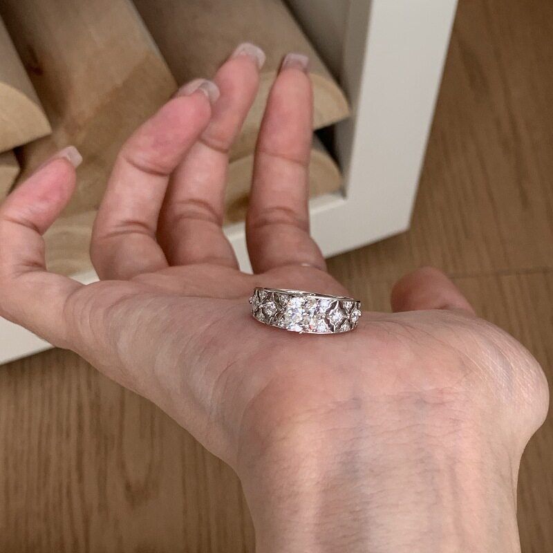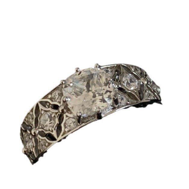 中古宫廷风轻奢小众复古镂空花纹方钻戒指镶嵌锆石高级设计感指环