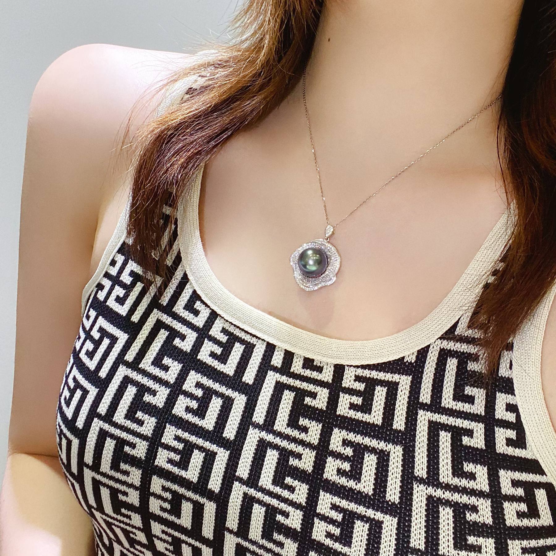 16-17mm孔雀绿珍珠山茶花款吊坠DZB313