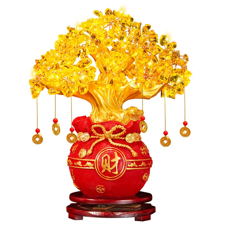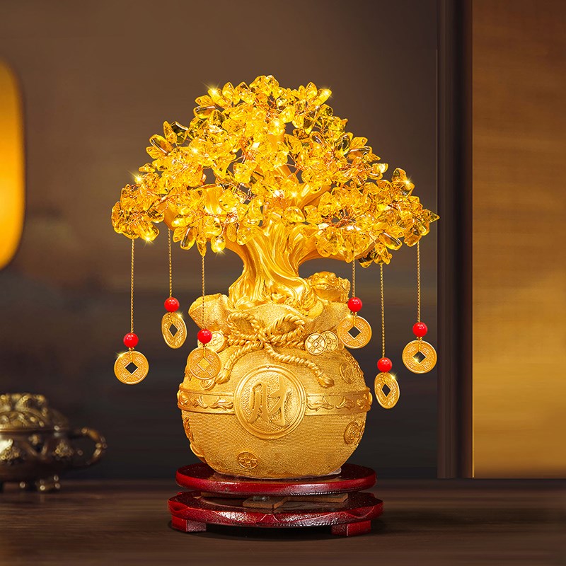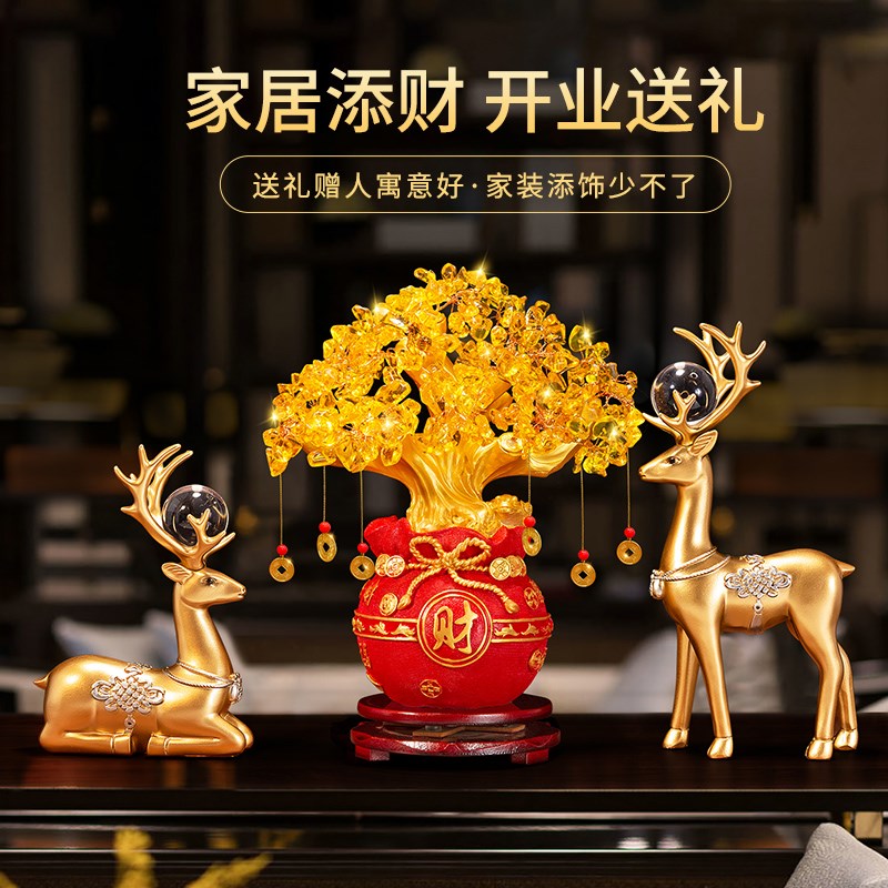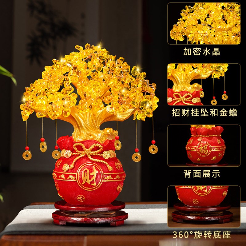 黄水晶摇钱发f财树摆件招财客厅玄关电J视柜酒柜装饰品乔迁开业礼