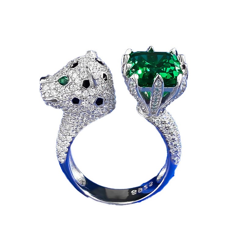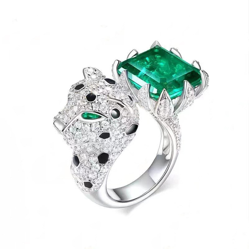 珠宝 925银戒指高碳钻豹子系列仿真祖母绿切割U8*10猎豹戒指