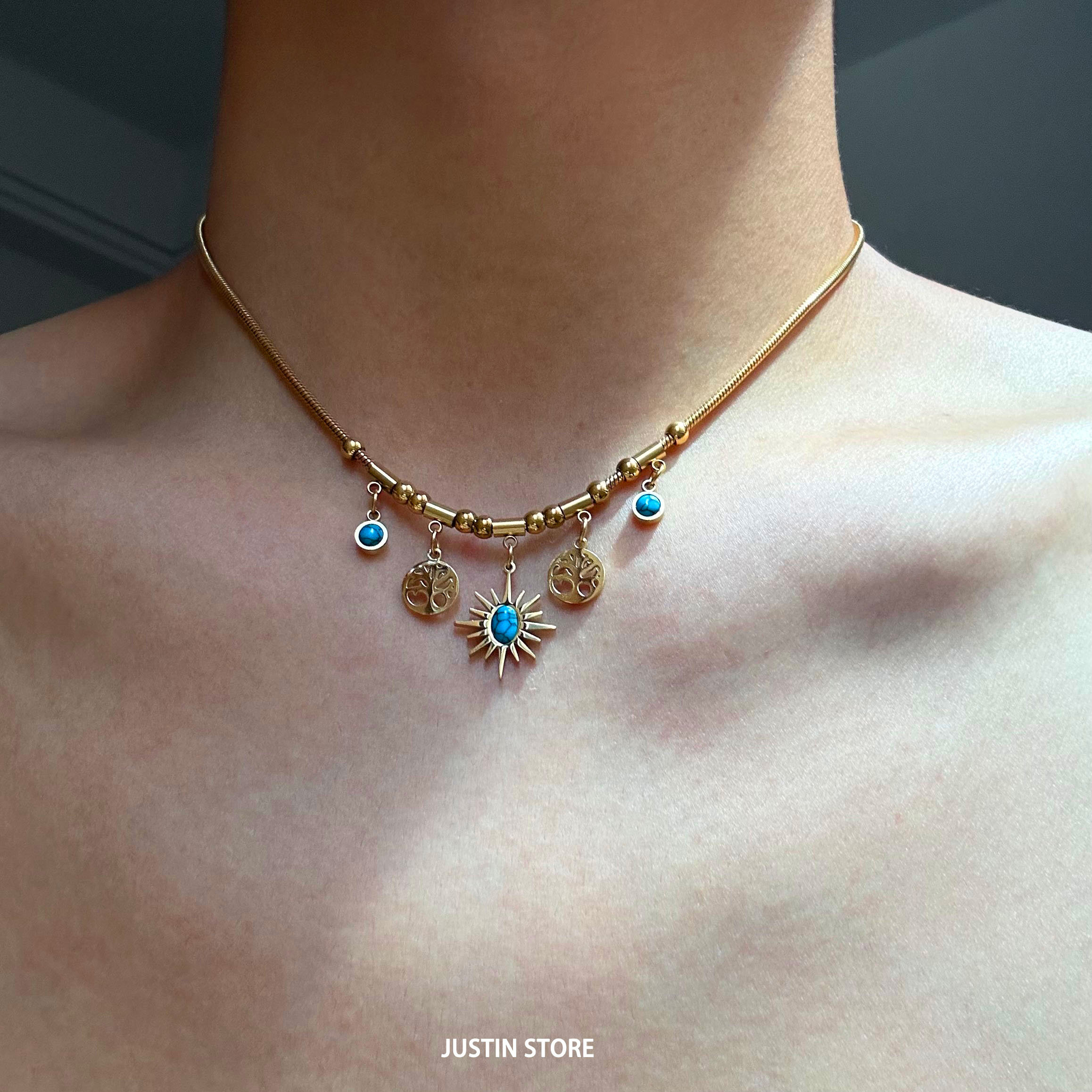 蓝松石vintage太阳花项链男小众设计感2025年新款饰品锁骨链