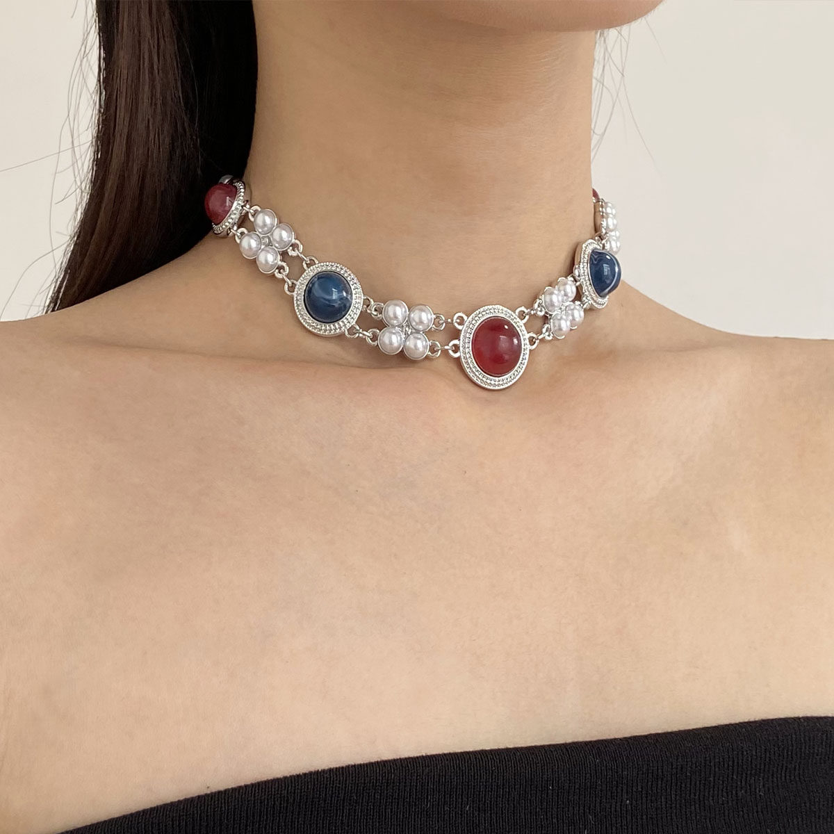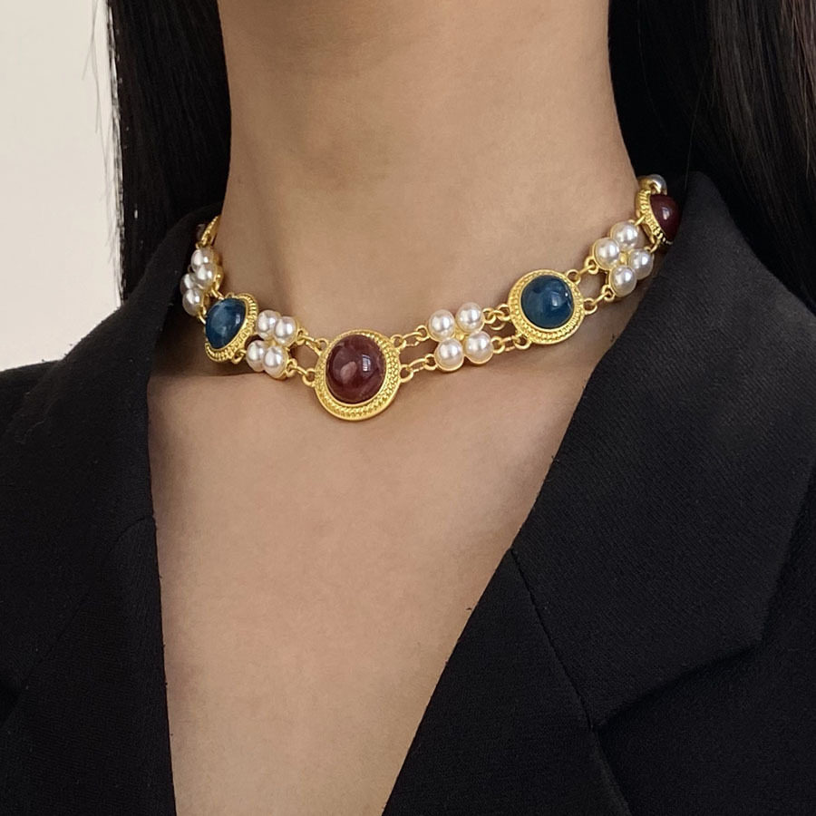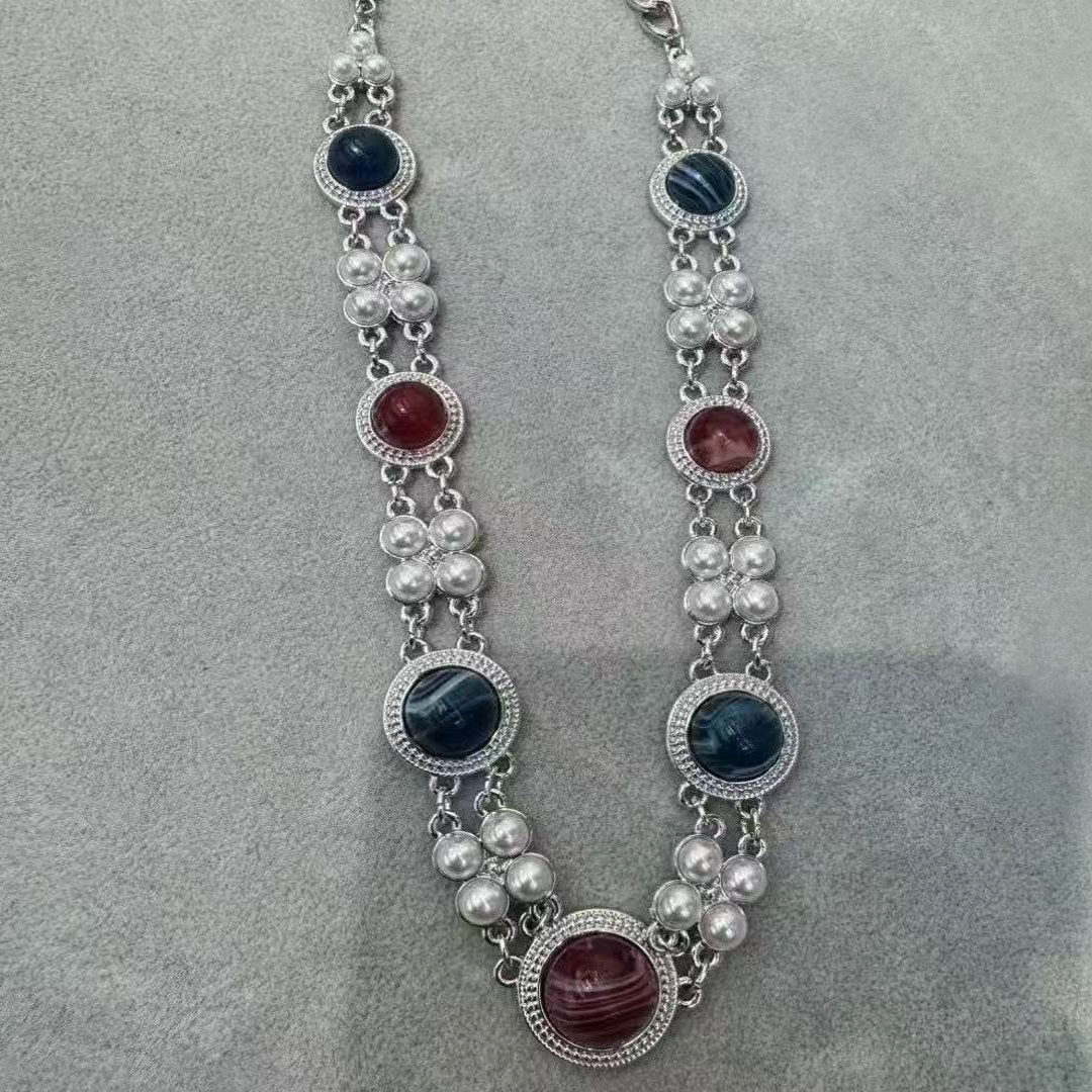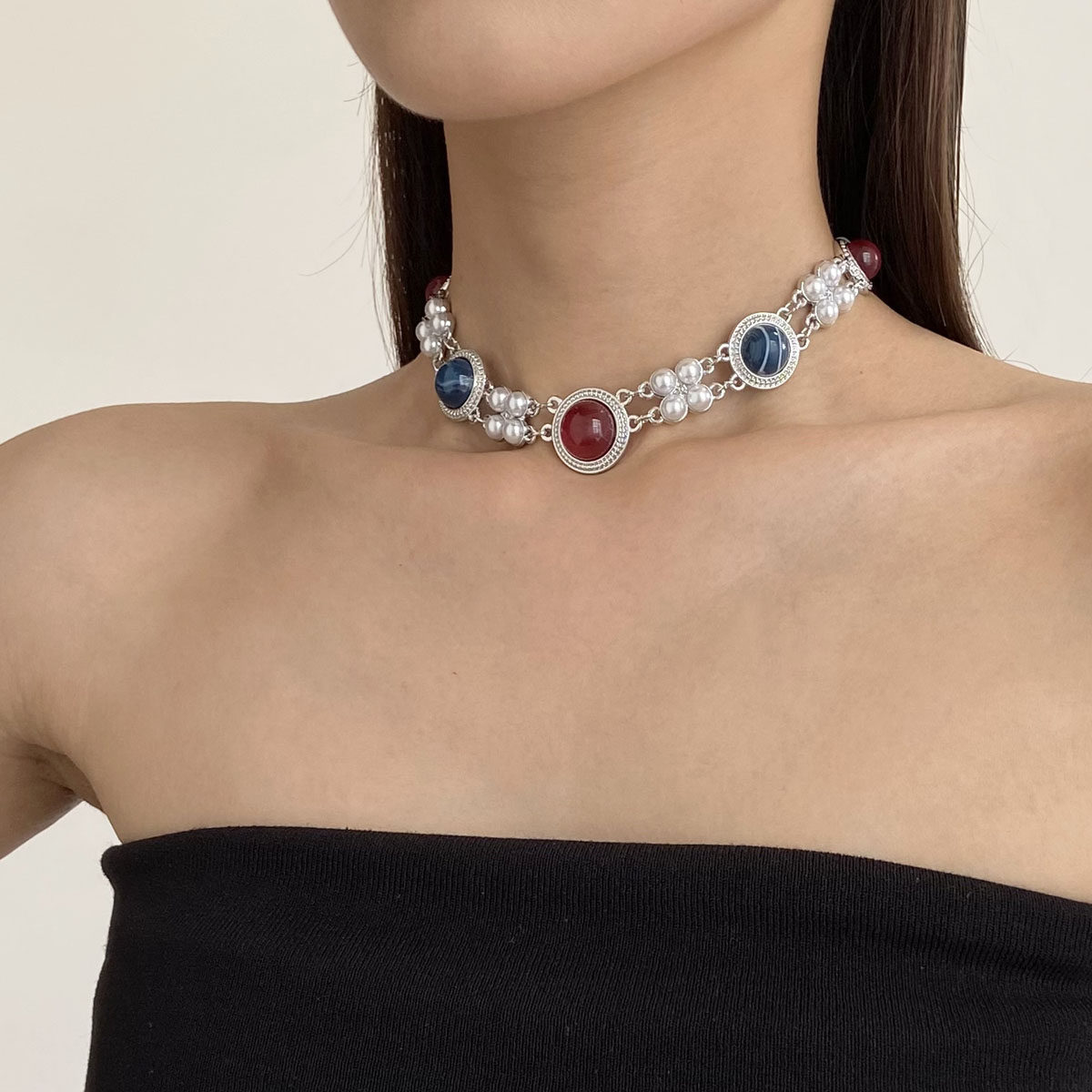 冷淡风美拉德红宝石链条拼接卫衣项链女中古高级感珍珠双层颈链