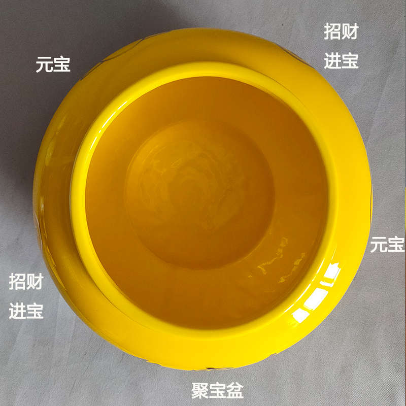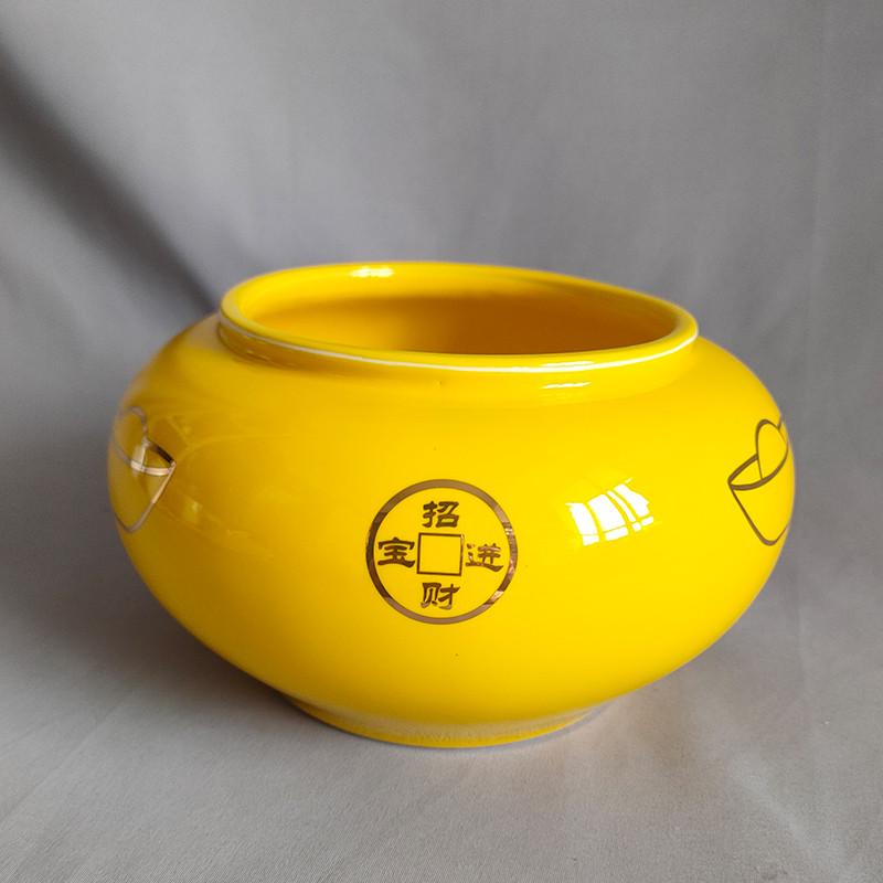 黄色聚宝盆陶瓷罐子摆件无盖带盖都有,招财进宝铜钱元宝图可绑绳
