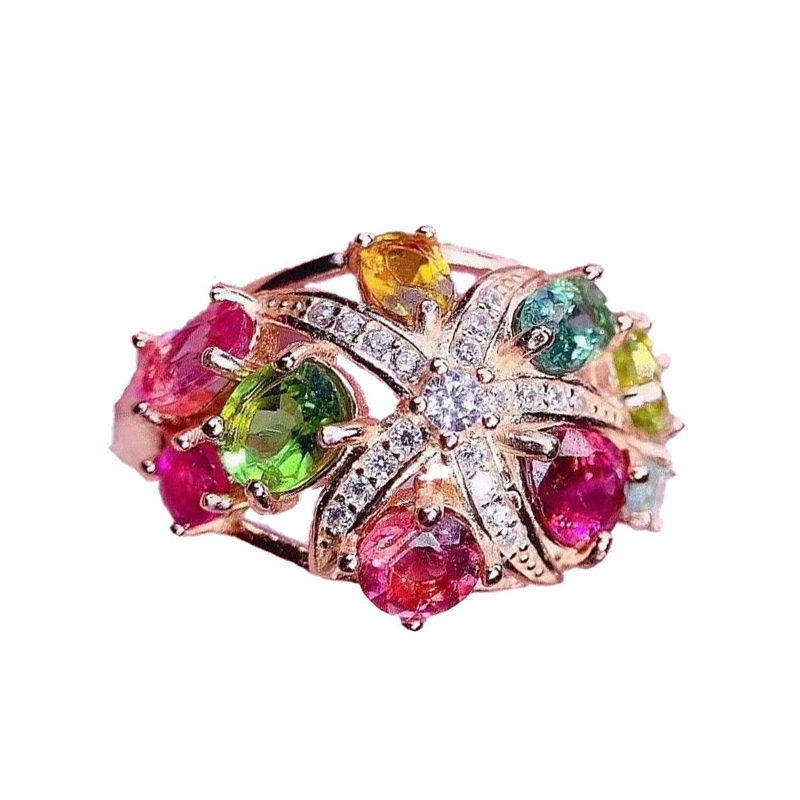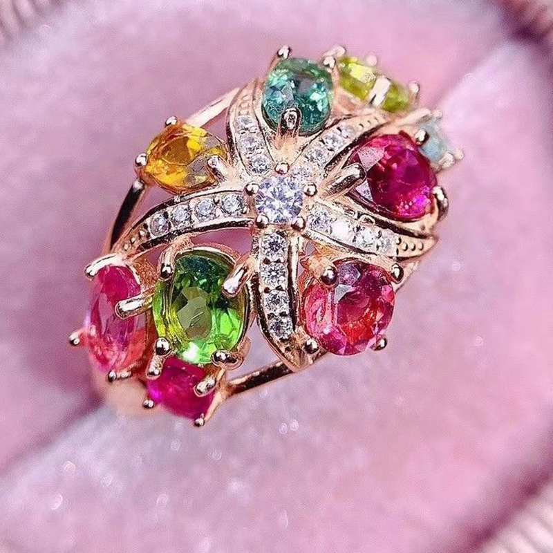 镀18K玫瑰金糖果色碧玺水晶满钻戒指轻奢时尚晶体干净火彩指环