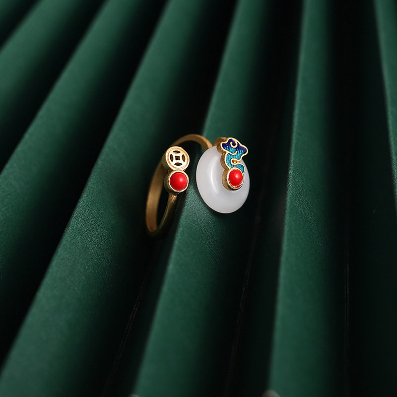 925纯银中国风祥云戒指女小众设计复古风和田玉开口尾戒时尚个性