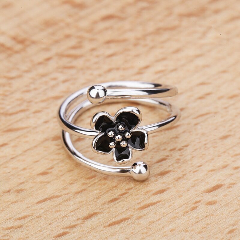 Young原创S925银滴油黑色花朵开口可调浪漫爱情戒指创意学生女