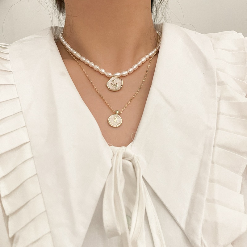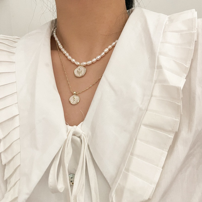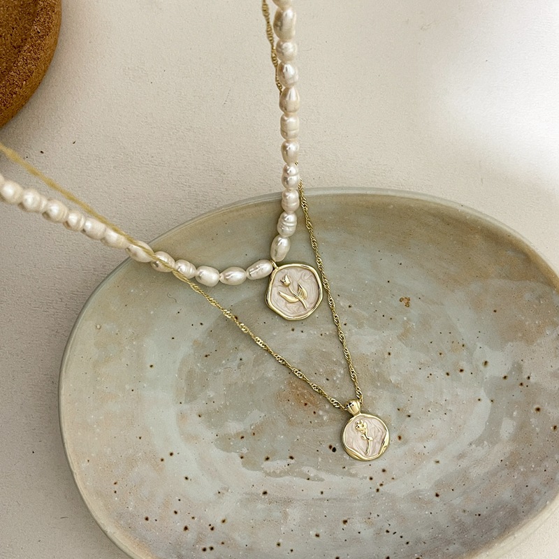 淡水真珍珠项链锁骨链法式高雅珠光白色珐琅复古玫瑰花金币颈链女