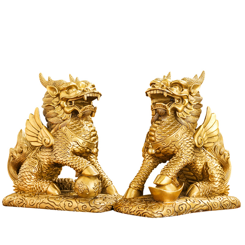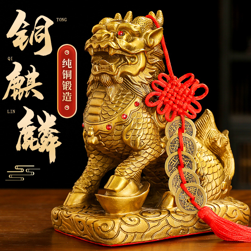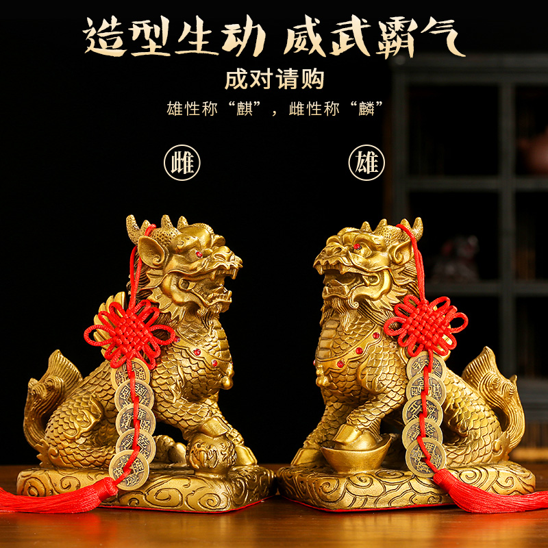 黄铜麒麟摆件一对踩八卦火麒麟摆件家居办公室装饰客厅桌面工艺品