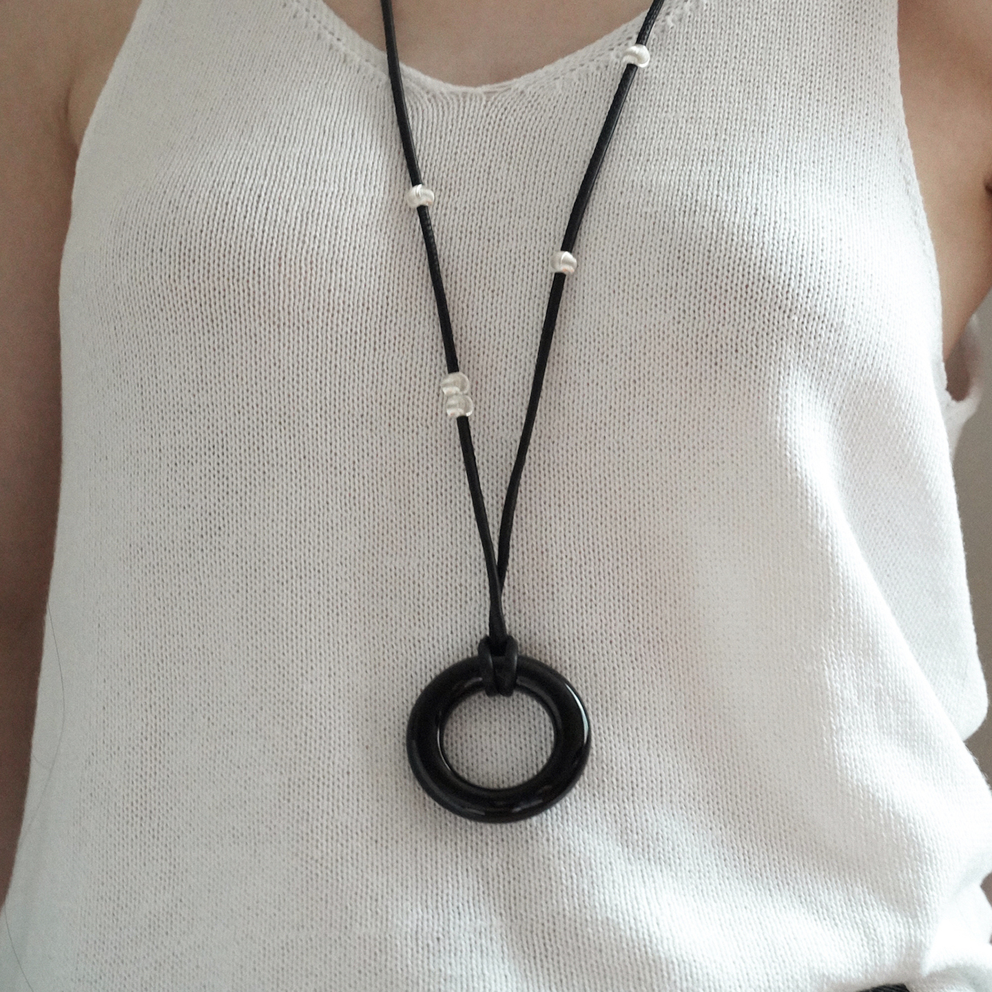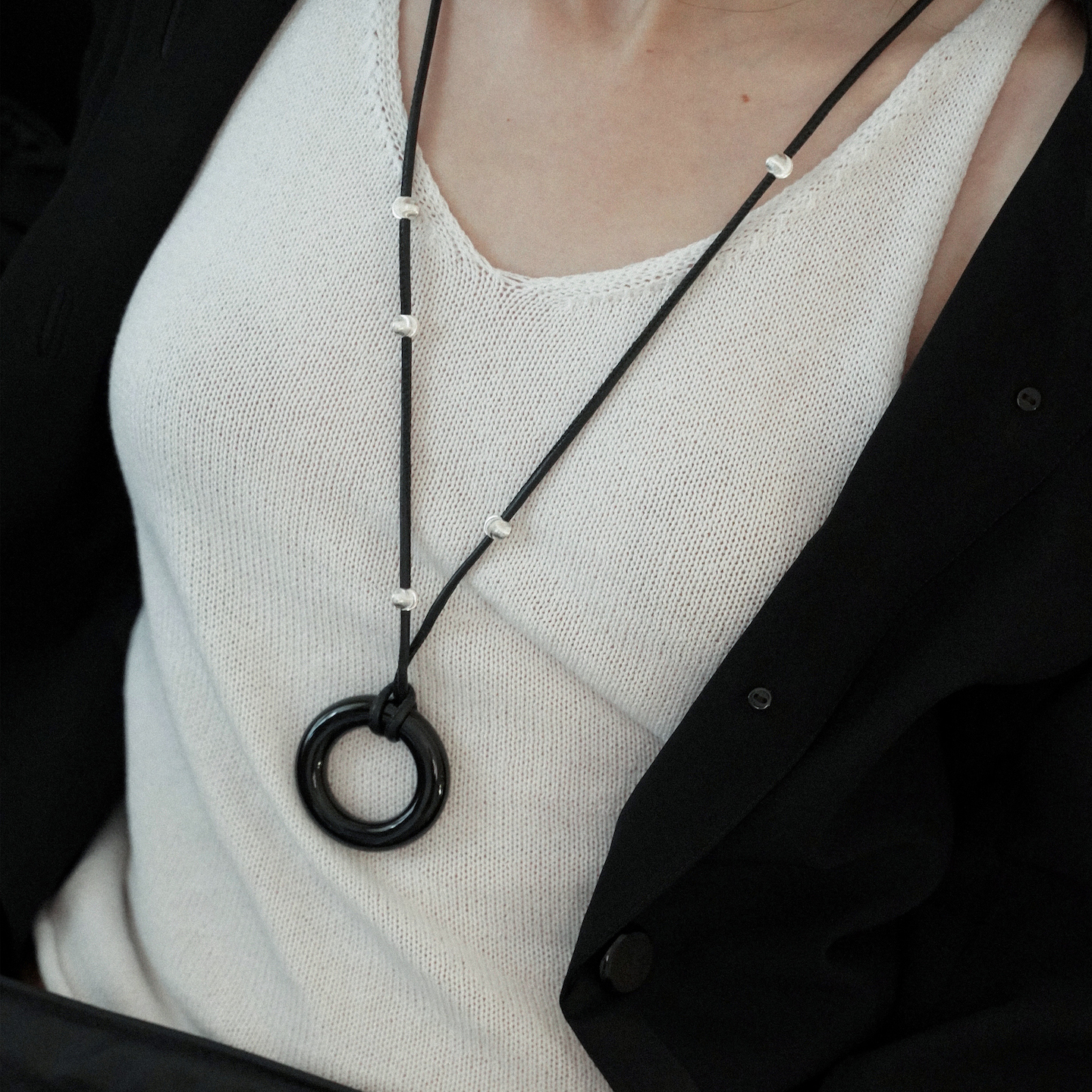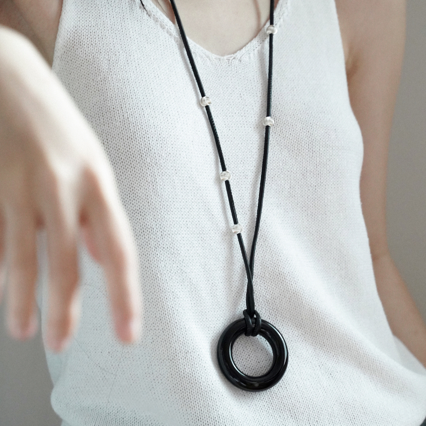 Limb掠目·海边月夜小众设计波纹猫眼黑玛瑙皮绳项链毛衣链猫眼珠