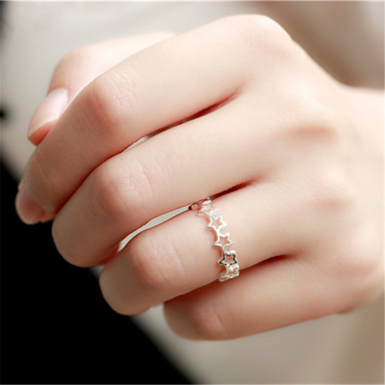 韩国S925镂空笑脸镀银戒指女五角星指环 ins潮星星链条复古开口戒