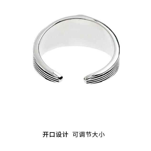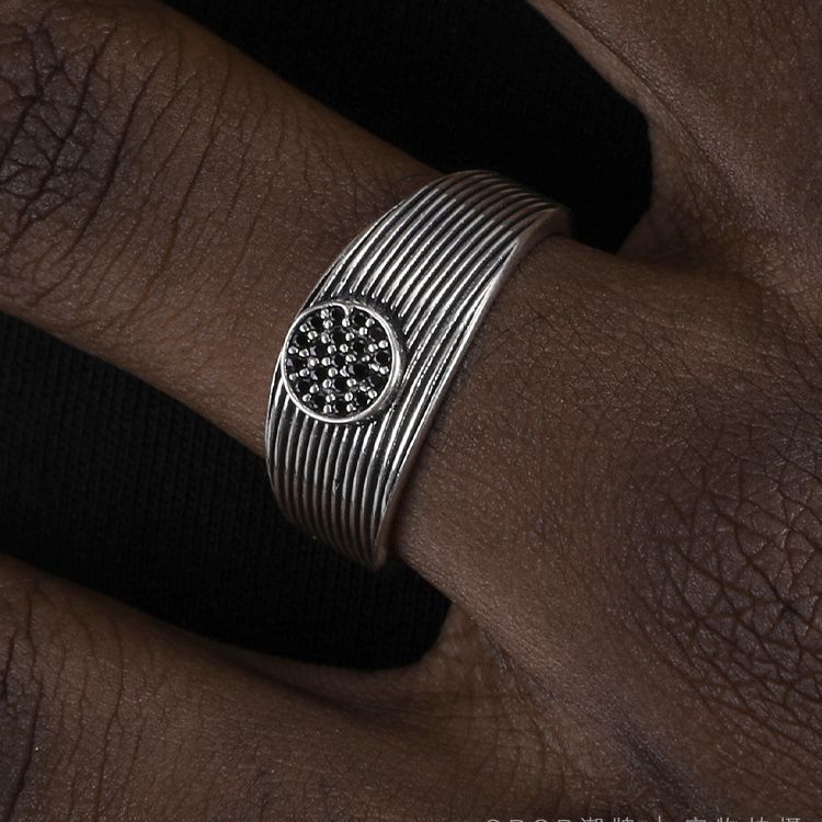 国风潮铜镀银手工饰品设计泰银色复古黑锆石条纹戒指嘻哈潮流个性