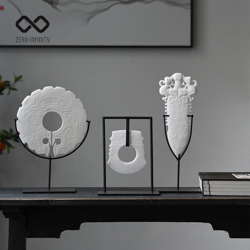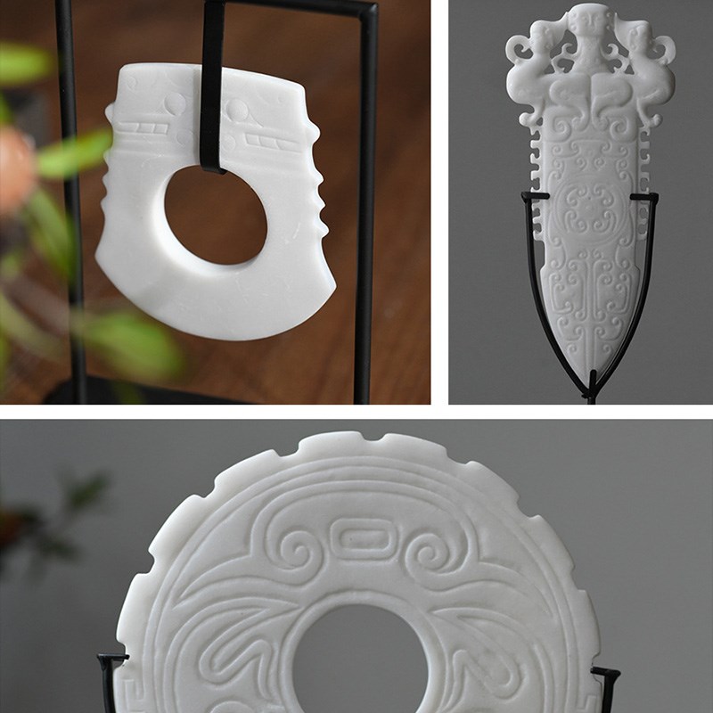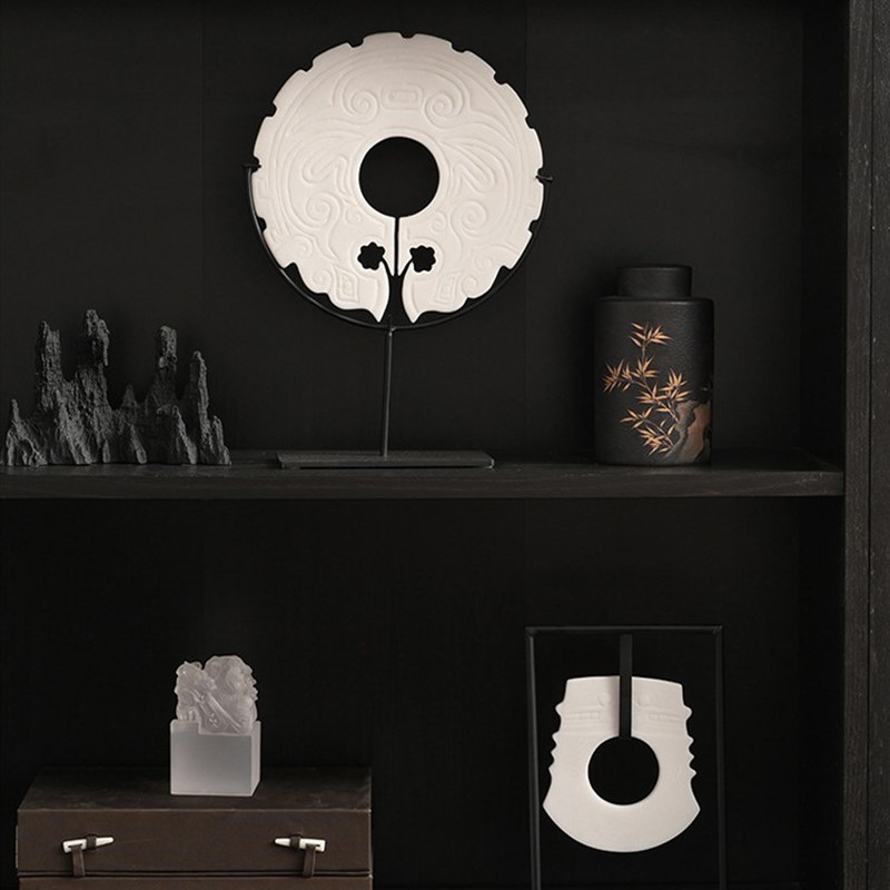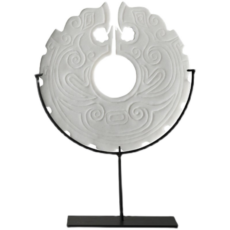 新中式汉白玉传统纹理斧钺玉璧摆件金属支架书房摆件样板房售楼部