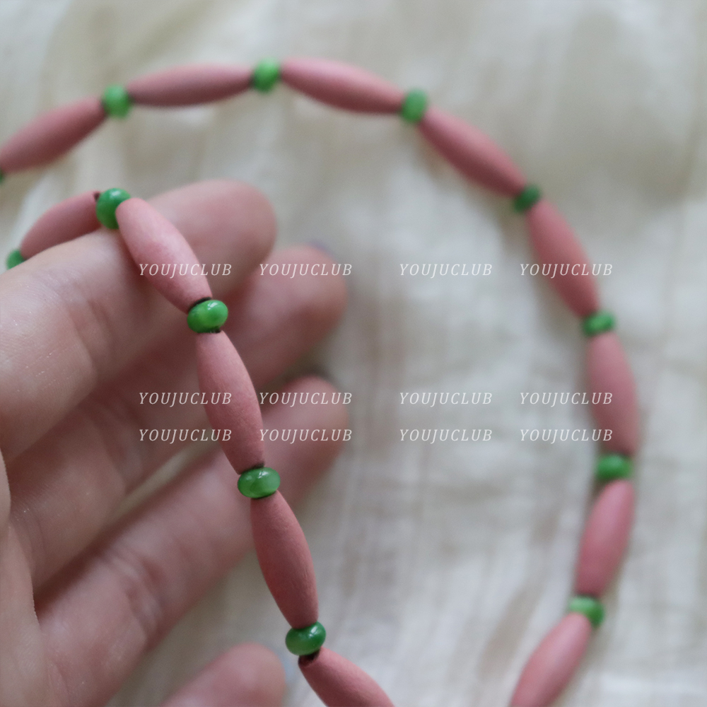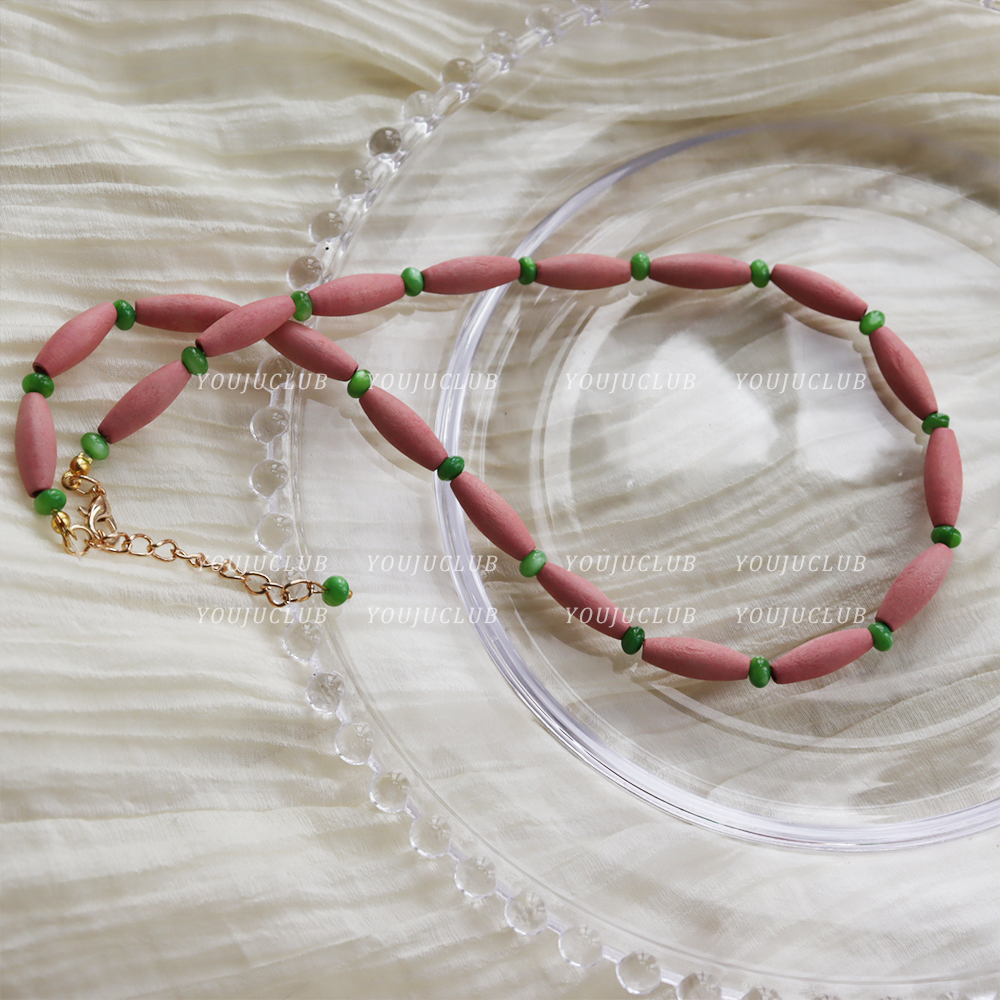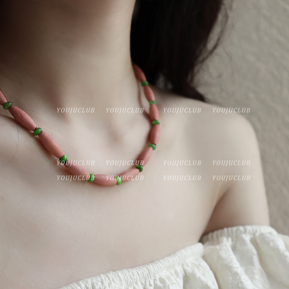 YOUJUclub-柳荷 粉绿木质小众设计复古天然石撞色串珠项链锁骨链