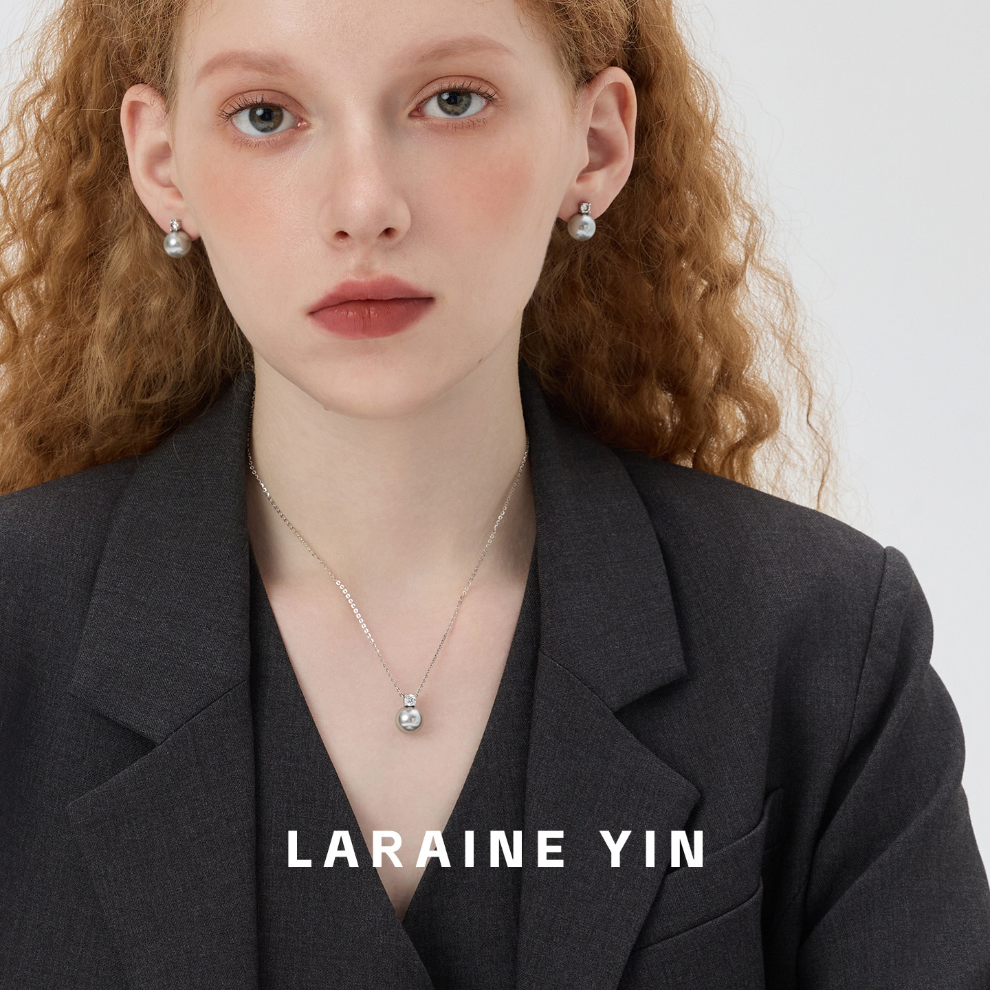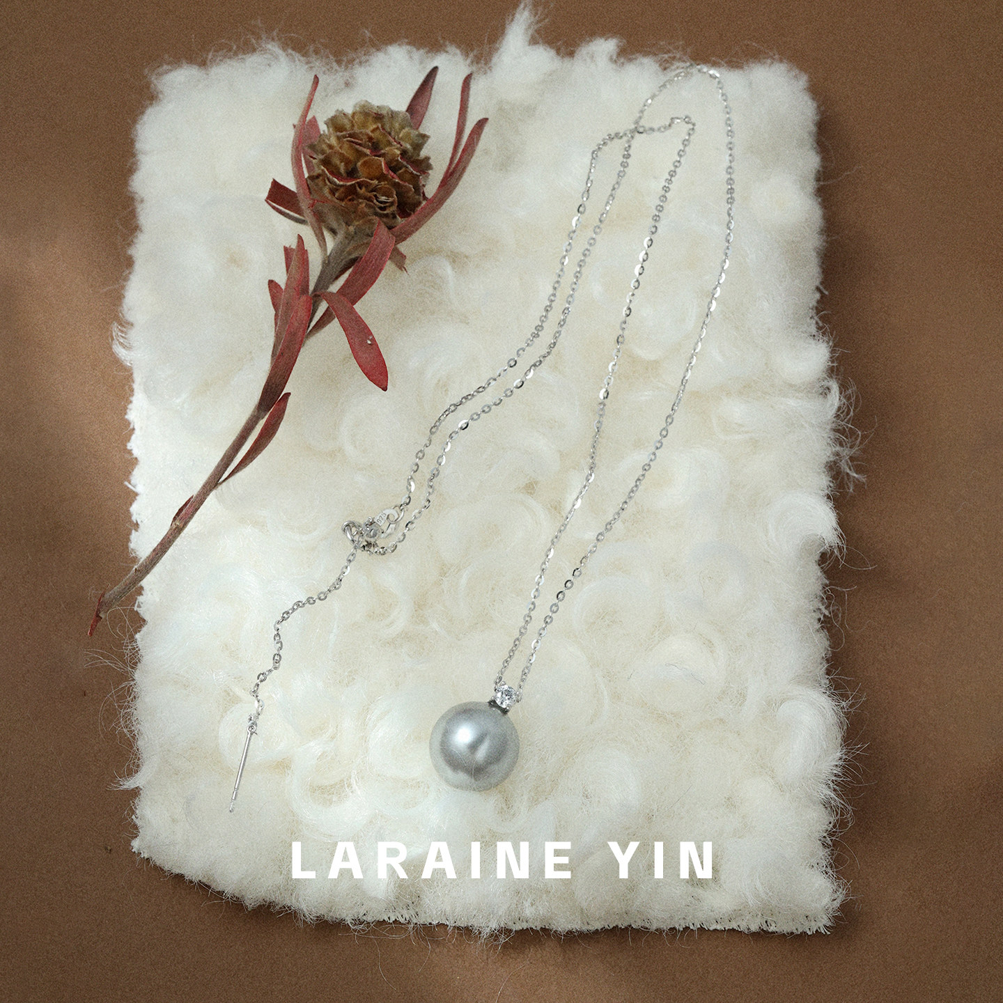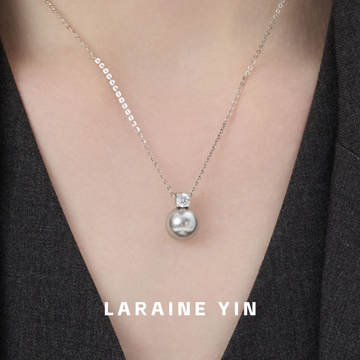 LARAINE YIN小众简约灰色珍珠锁骨链 通体纯银轻奢闪钻毛衣项链