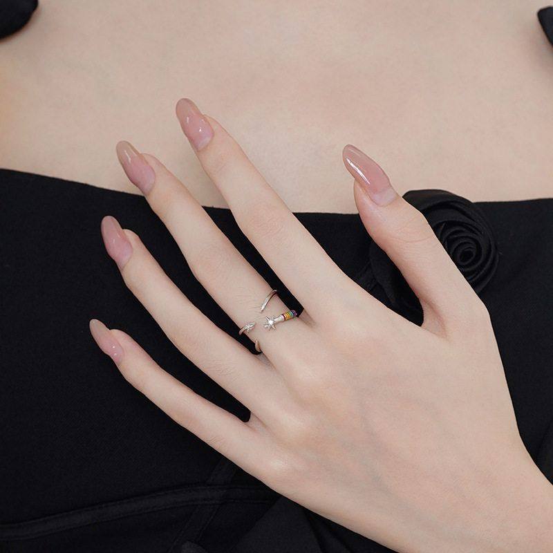 甜酷风S925纯银多巴胺彩虹线圈食指戒女开口镶钻六芒星戒指