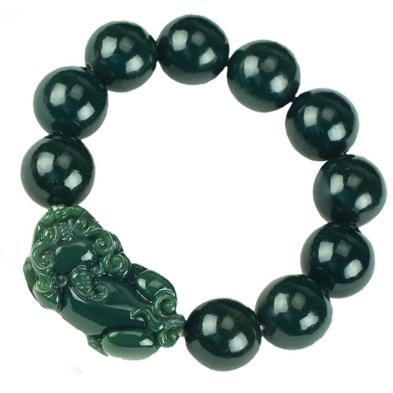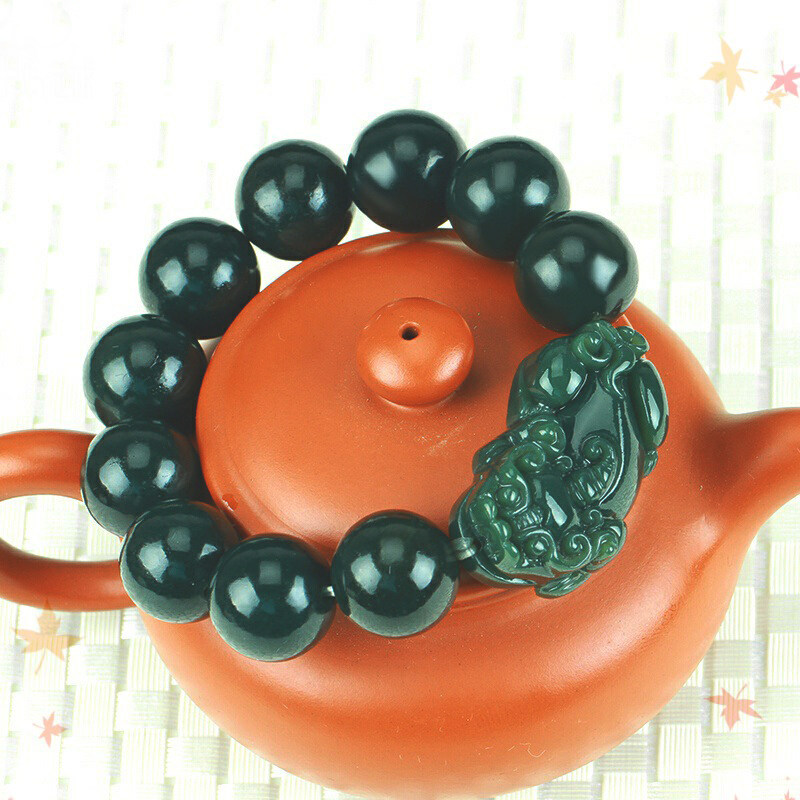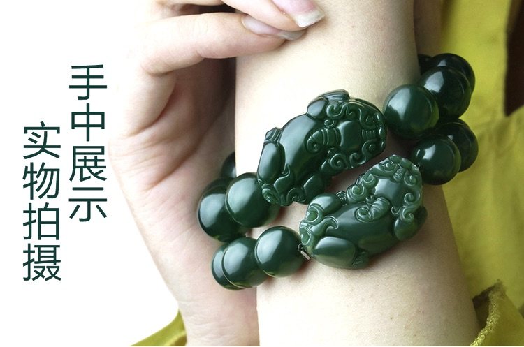 天然新疆和田玉青玉貔貅手链 男女情侣款 男士招财玉石皮丘佛珠串