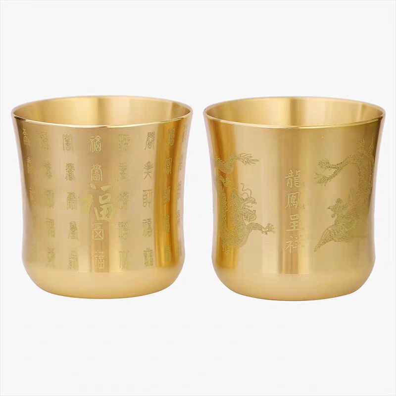 龙凤呈祥杯百福杯激光雕刻复古茶杯酒杯纯黄铜杯摆件黄铜茶桌装饰