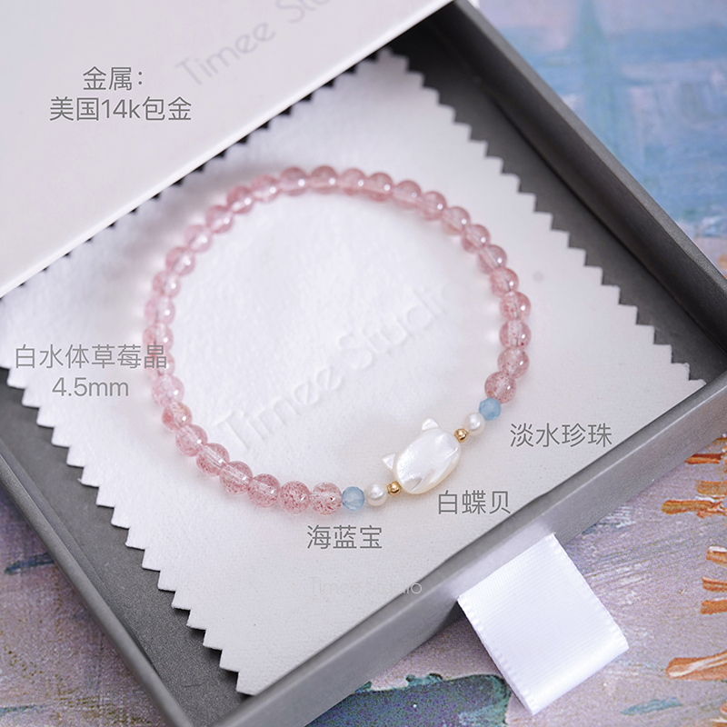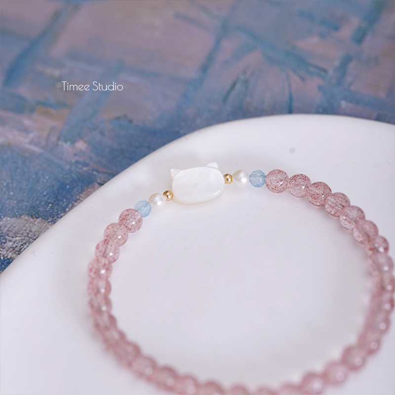Timee恬觅 猫耳软糖 天然草莓晶海蓝宝珍珠白蝶贝猫咪弹力绳手链