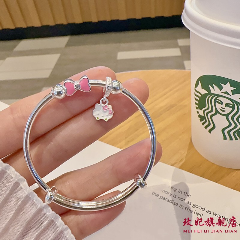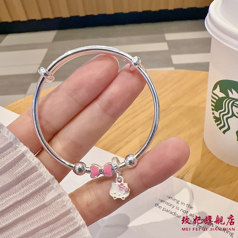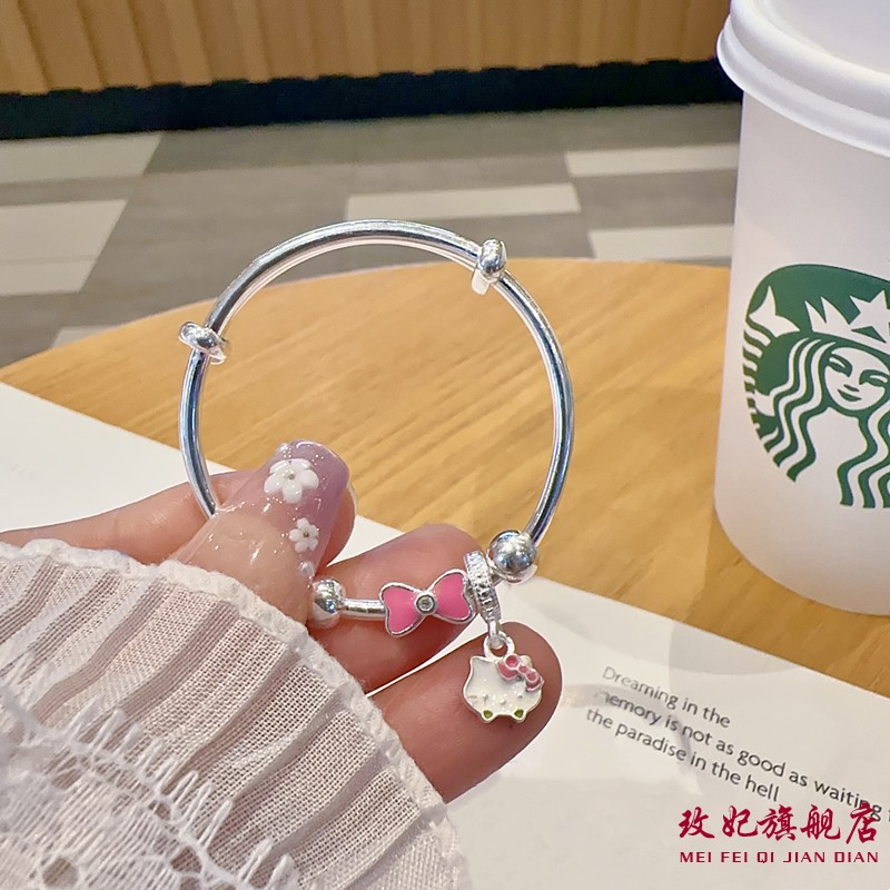 玫妃正生蝴蝶结kt猫纯银手镯足银9999女宝宝儿童中大童学生小孩款