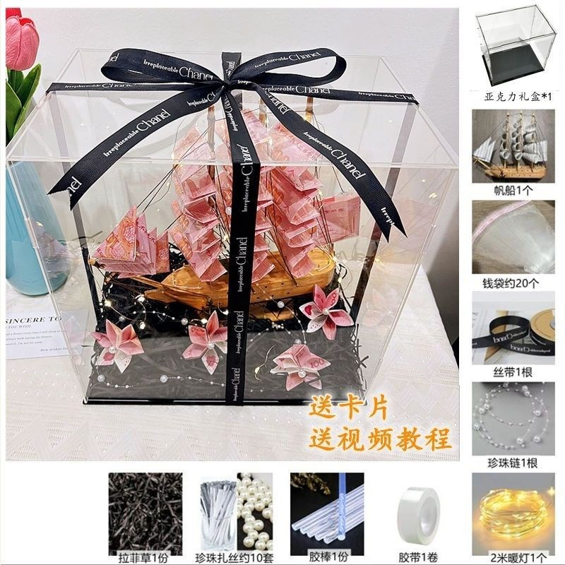 钞票花盒一帆风顺帆船现金有钱花diy材料包手提亚克力情人节礼物