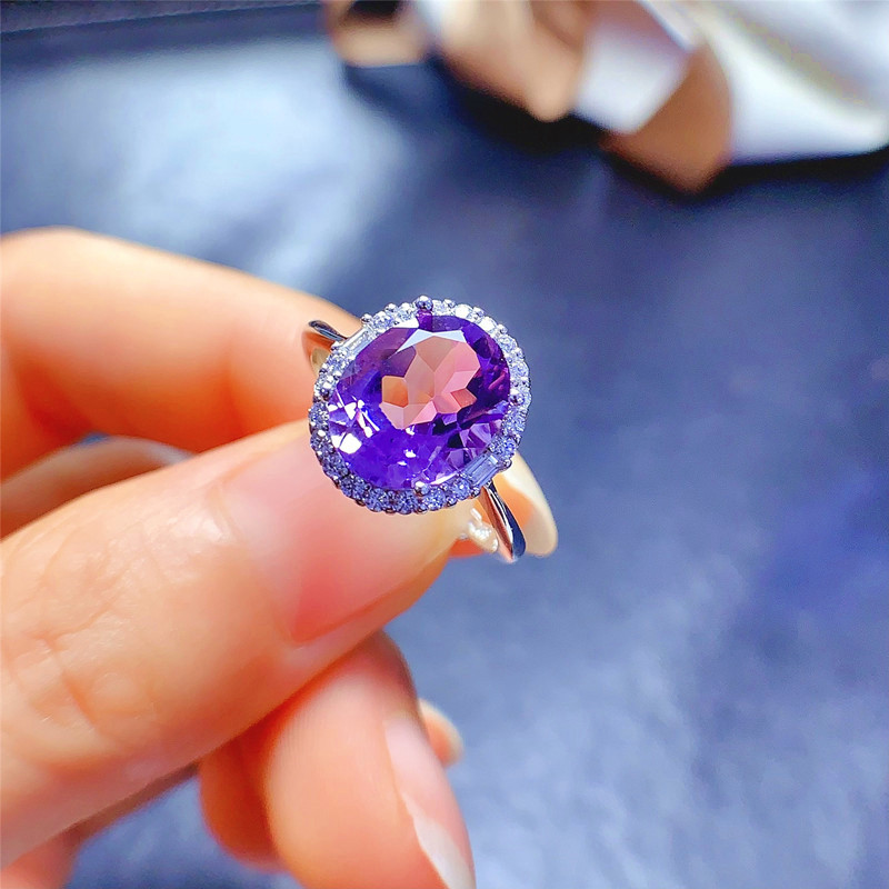 正品天然紫水晶戒指女纯银镶嵌气质精致时尚招财紫色宝石指环开口