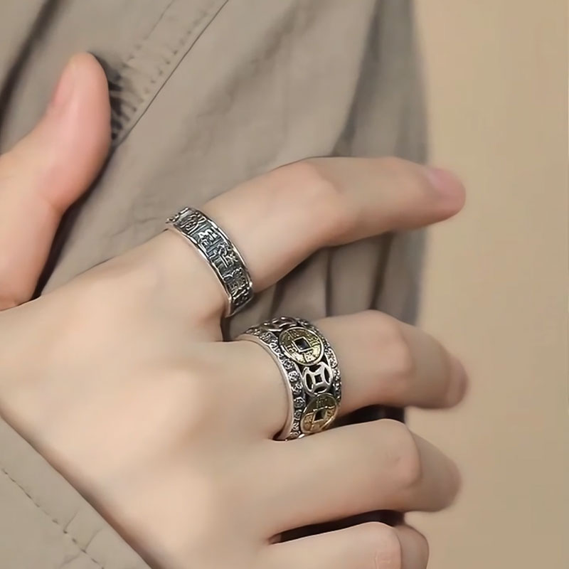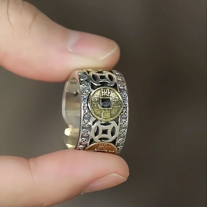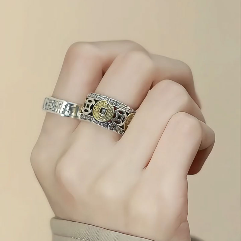 复古925银招财进宝戒指女新中式五帝钱币小众设计个性开口食指戒