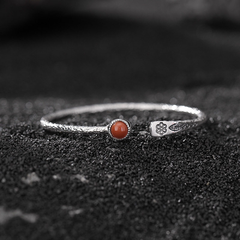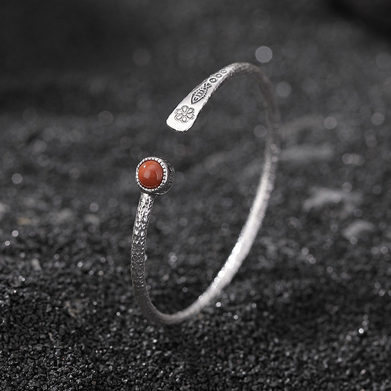 山予棠南红玛瑙手环S999.9足银锤纹小鱼小花精致开口手镯