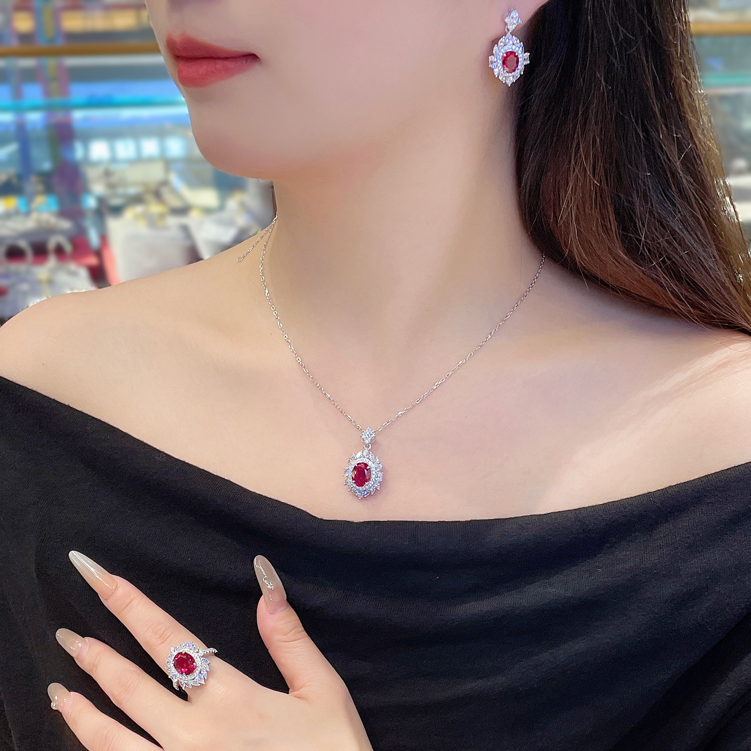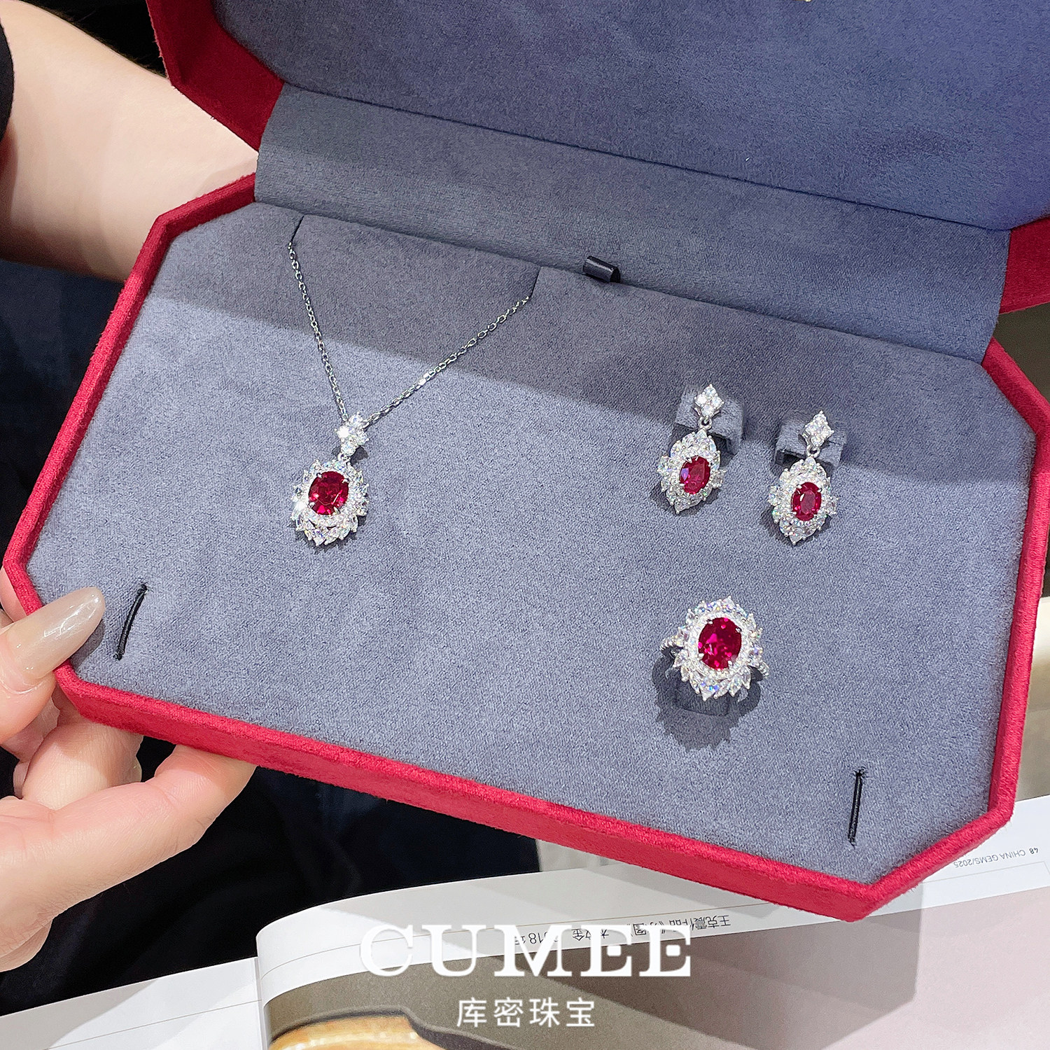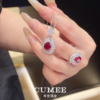 CUMEE 经典百搭款 鸽血红色培育红宝石女款戒指吊坠套装.银镀金