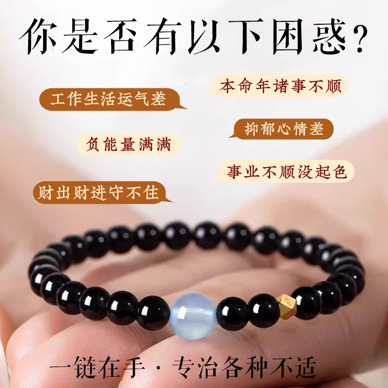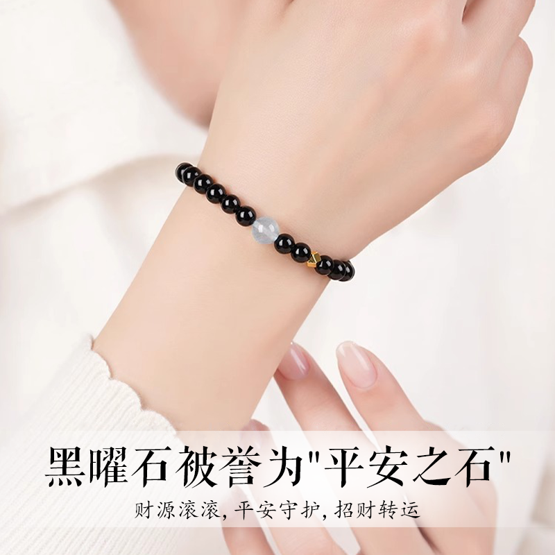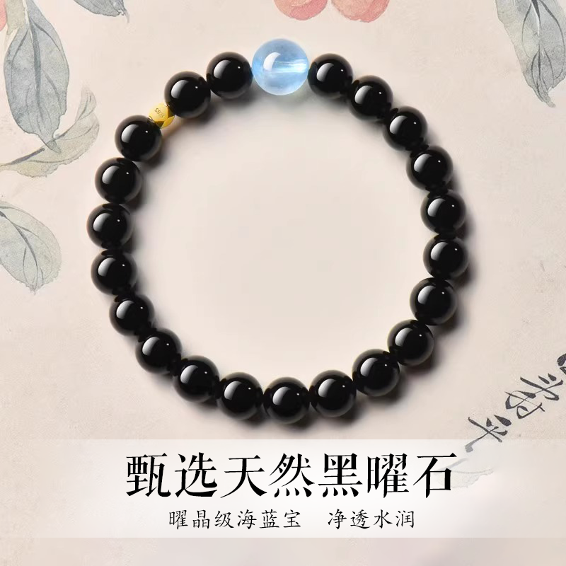 天然黑曜石手串海蓝宝水晶男女款手链平安守护补水聚财转运珠护身