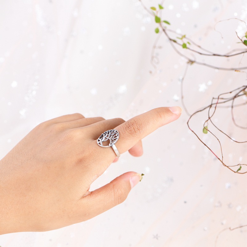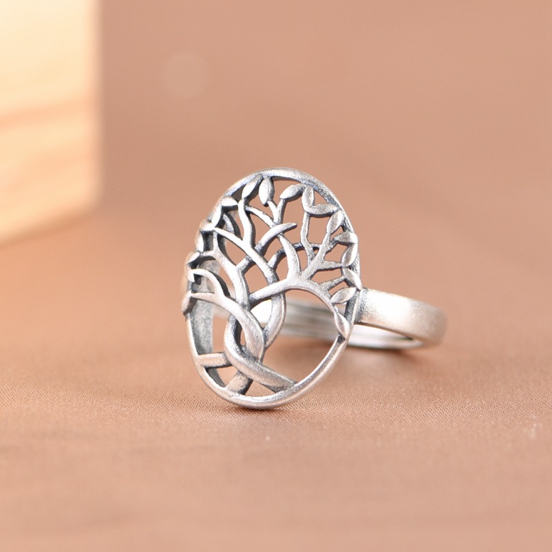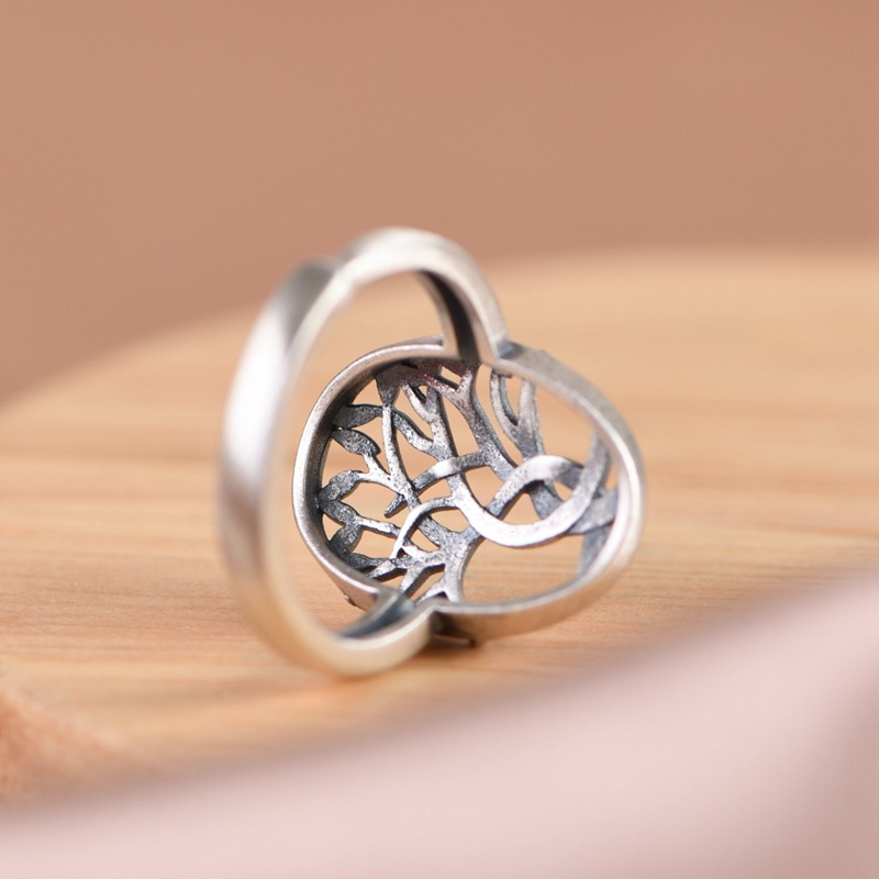 S925纯银戒指女款开口镂空花卉幸福树小众设计国潮民族风银饰指环
