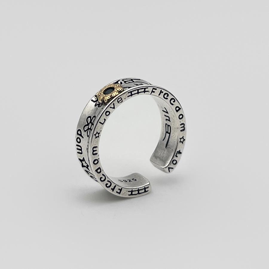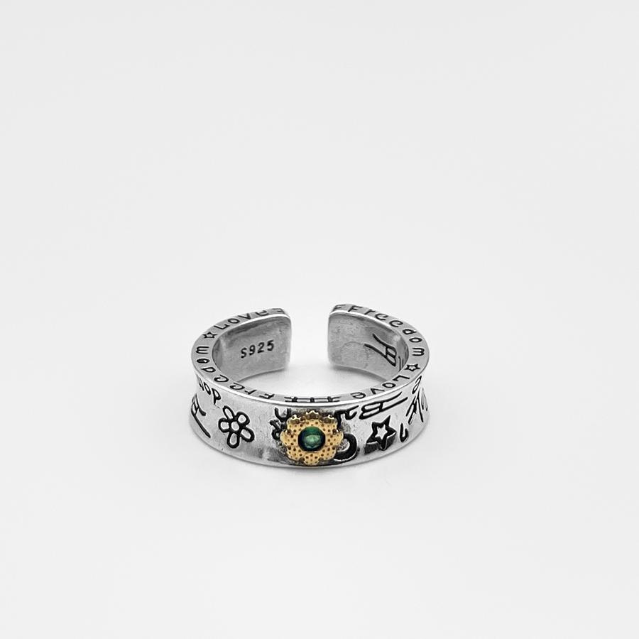 WHYBLUE 复古字母涂鸦花朵绿宝石戒指男女时尚个性开口可调节指环