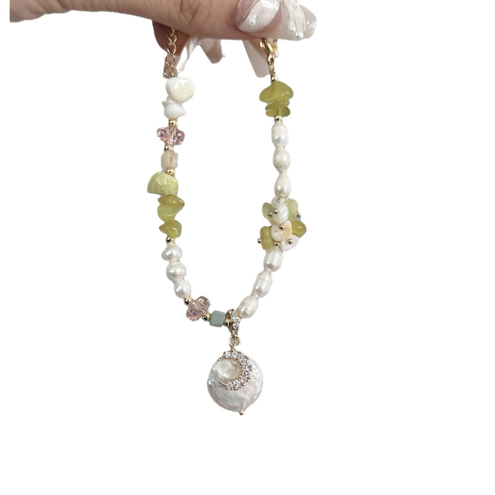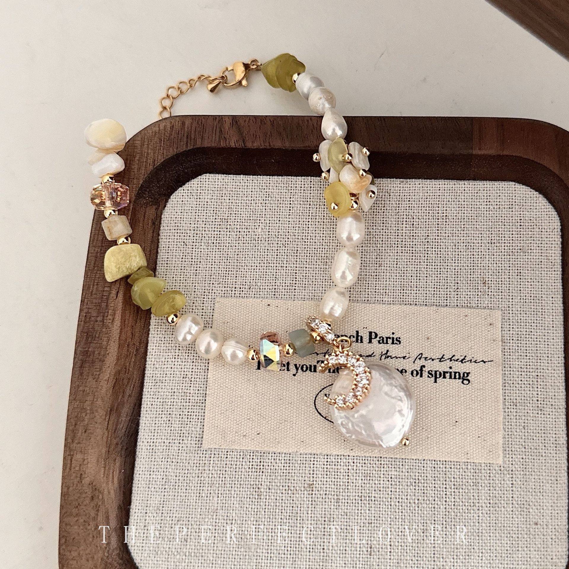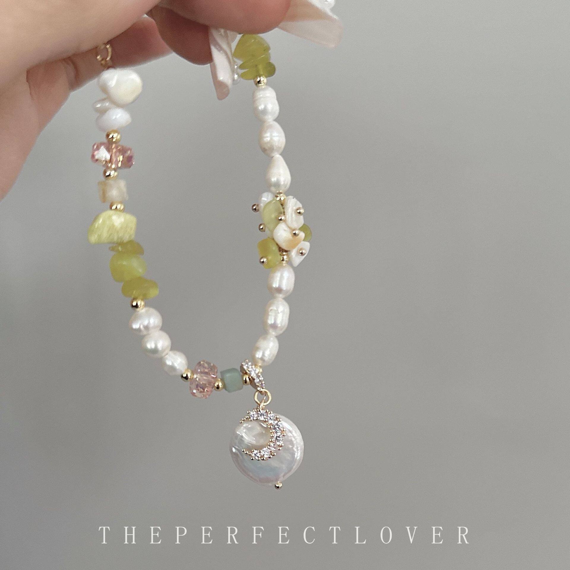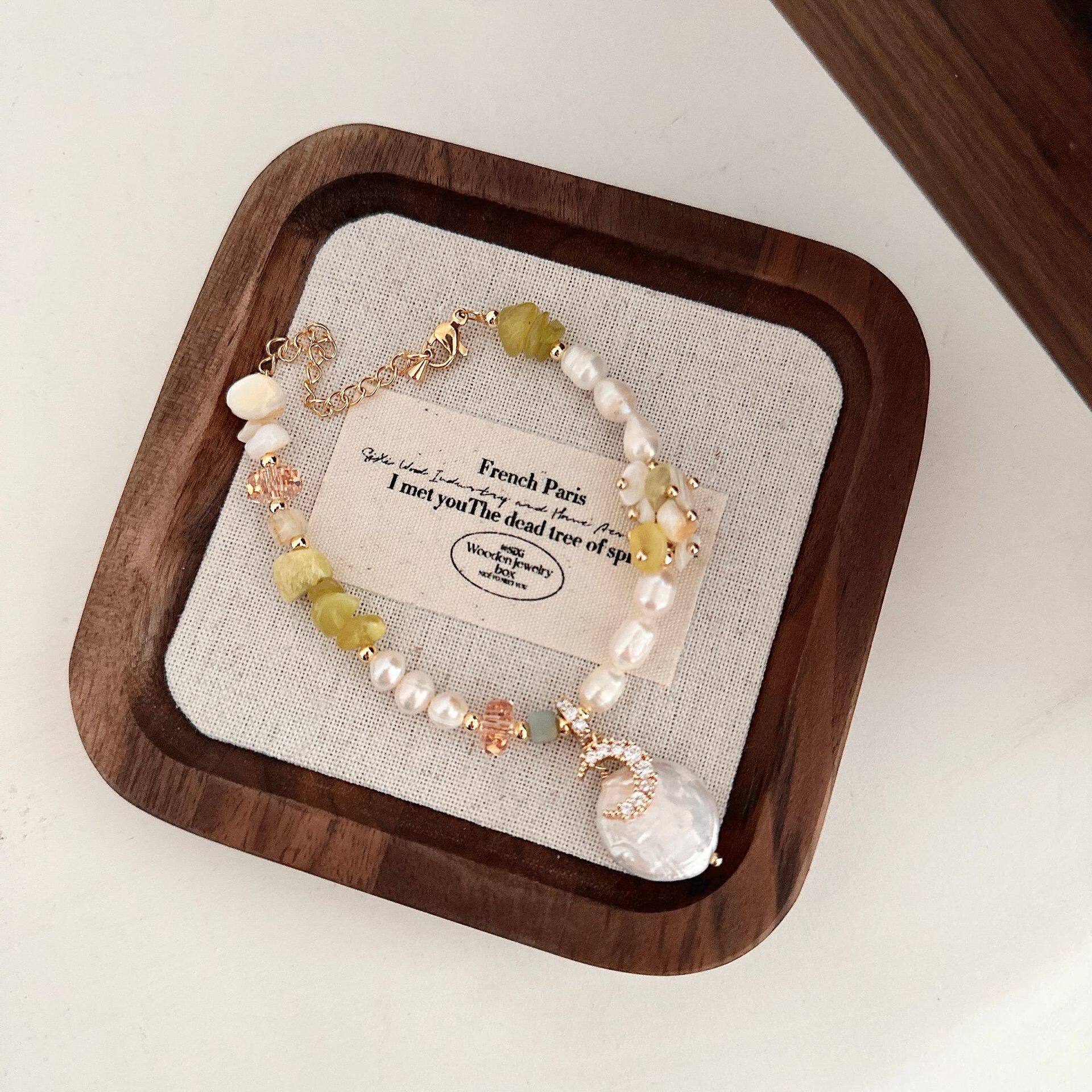 天然石黄色水晶淡水珍珠月亮锆石吊坠手链东大门高级感小清新手串