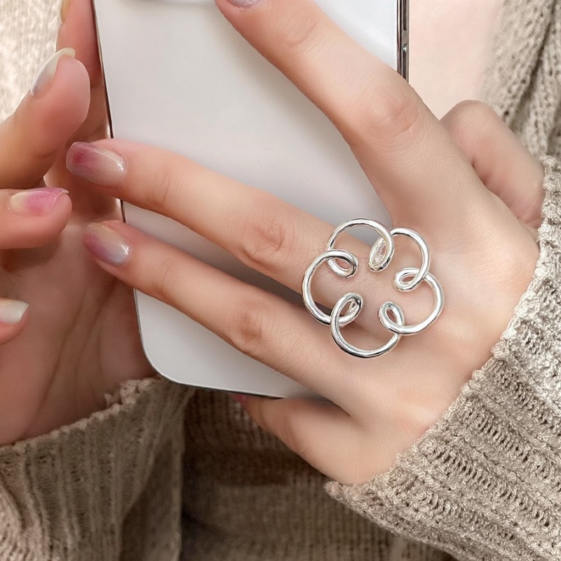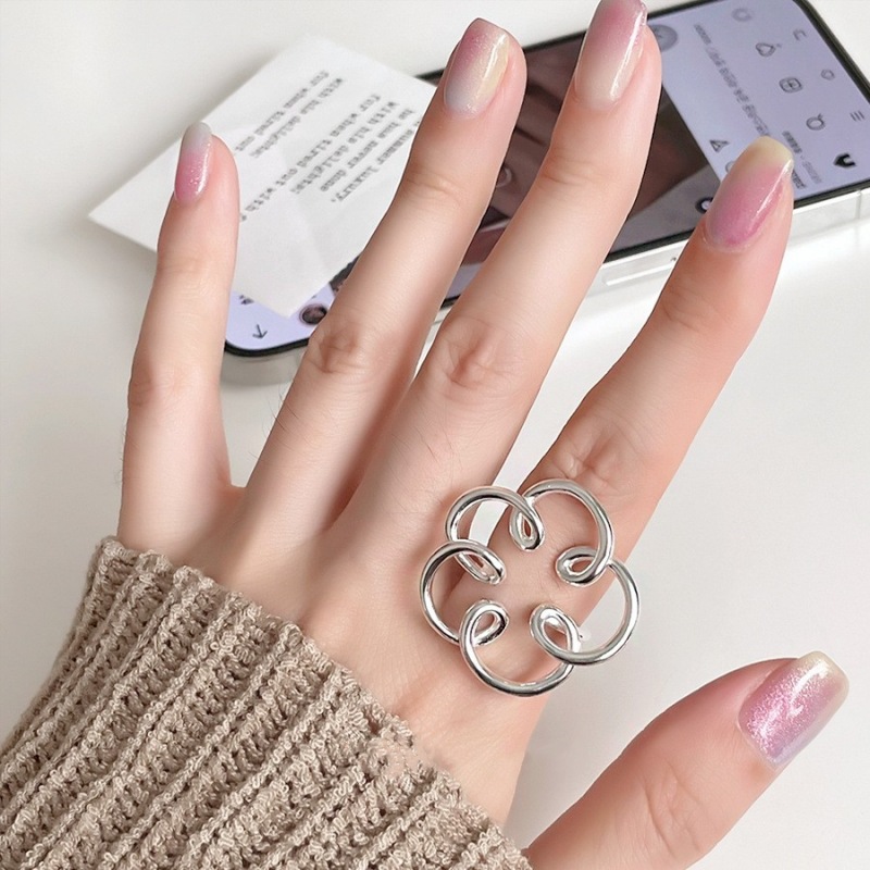 【两件包邮】甜酷花朵戒指女夸张气质几何线条缠绕S925镀银开口指