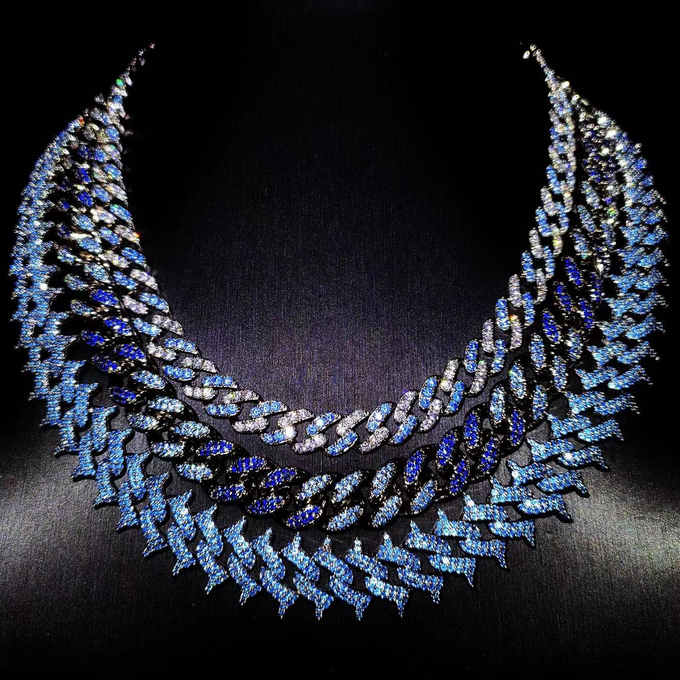 Mr.Blingggggg欧美嘻哈珠宝 16mm定制满钻海蓝色尖刺荆棘古巴链