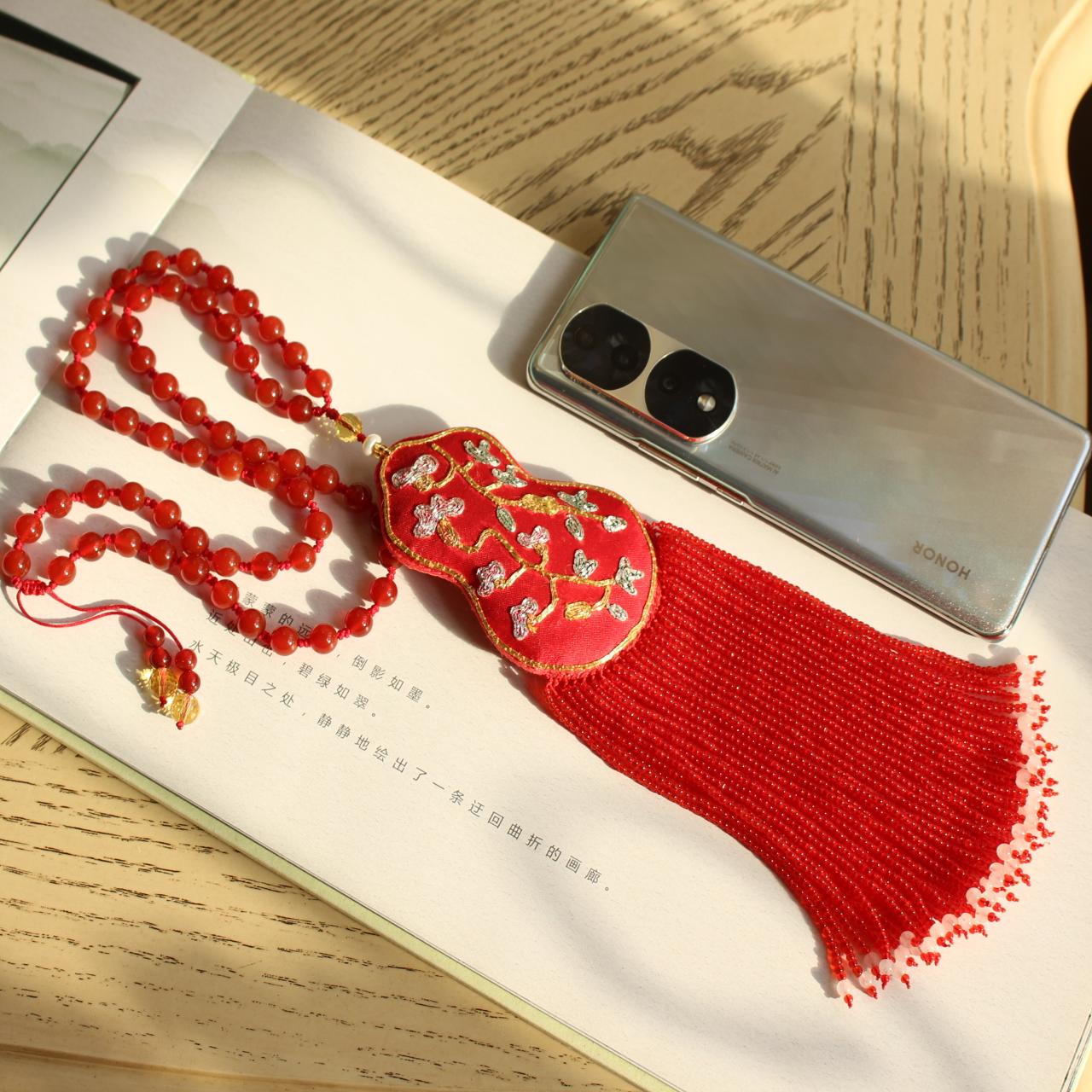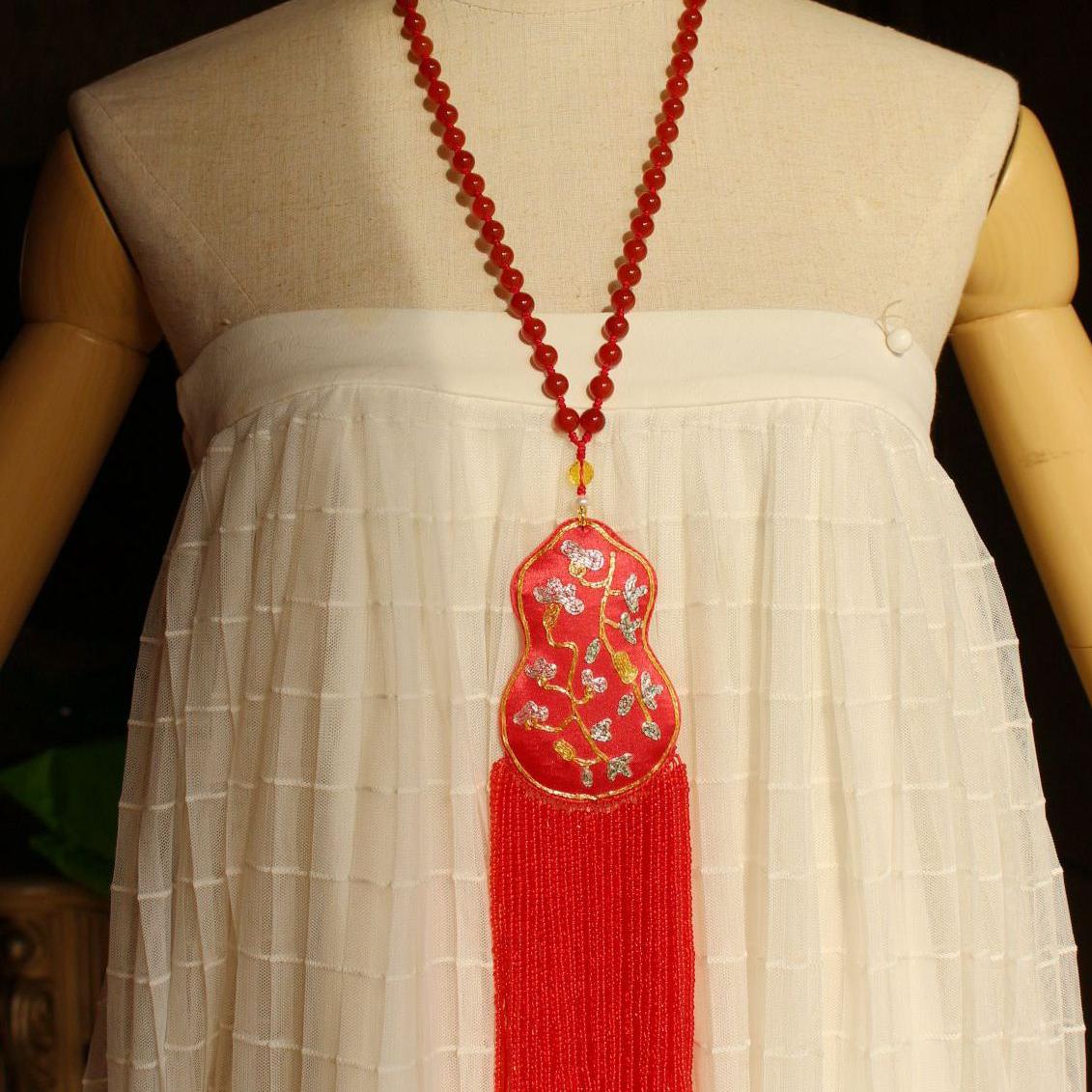 盘金绣红葫芦吉祥保平安 双面手绣珠穗金流苏中式项链吉祥长项链